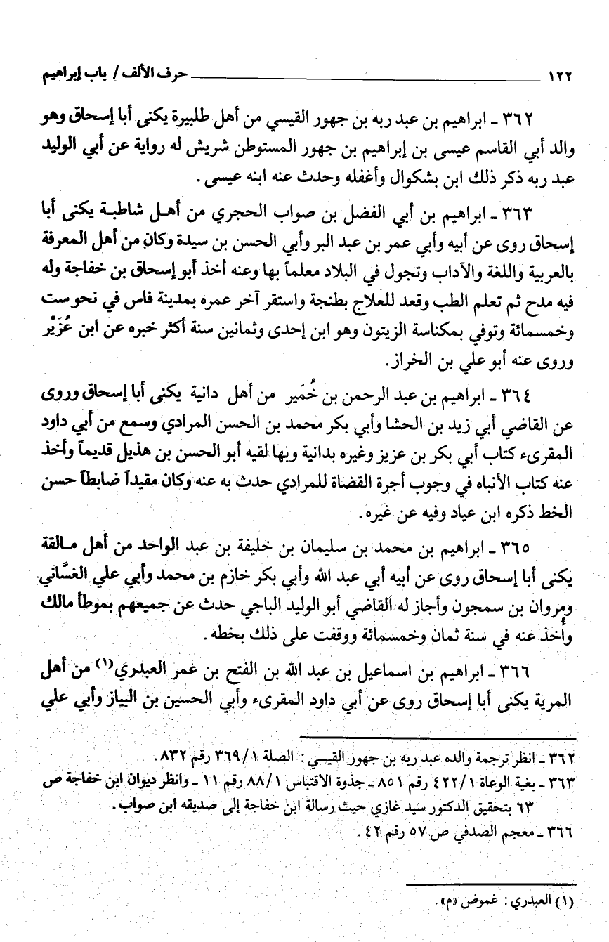 366 - إِبْرَاهِيم بْن إِسْمَاعِيل بْن عَبْد اللَّه بْن الْفَتْح بْن عُمَر الْعَبدَرِي من أَهْلَ المرية يكنى أَبَا إِسْحَاق روى عَنْ أبي دَاوُد المقرىء وَأبي الْحُسَيْن بْن البياز وَأبي عَليّ
