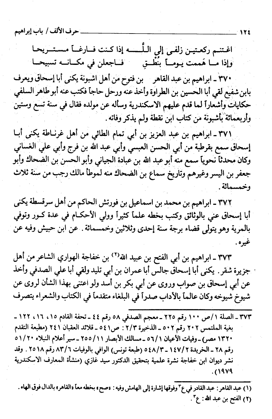 370 - إِبْرَاهِيم بْن عَبْد القاهر بْن فتوح من أَهْلَ أشبونة يكنى أَبَا إِسْحَاق وَيعرف بِابْن شَفِيع لَقِي أَبَا الْحُسَيْن بْن الطراوة وَأخذ عَنْهُ ورحل حَاجا فَكتب عَنْهُ أَبُو طَاهِر السِّلَفيّ حكايات وأشعارًا لمّا قَدِمَ عَلَيْهِم الْإسْكَنْدَريَّة وَسَأَلَهُ عَنْ مولده فَقَالَ فِي سنة تسع وَسِتِّينَ وَأَرْبَعمِائَة بأشبونة من كتاب ابْن نقطة وَلم يذكر وَفَاته