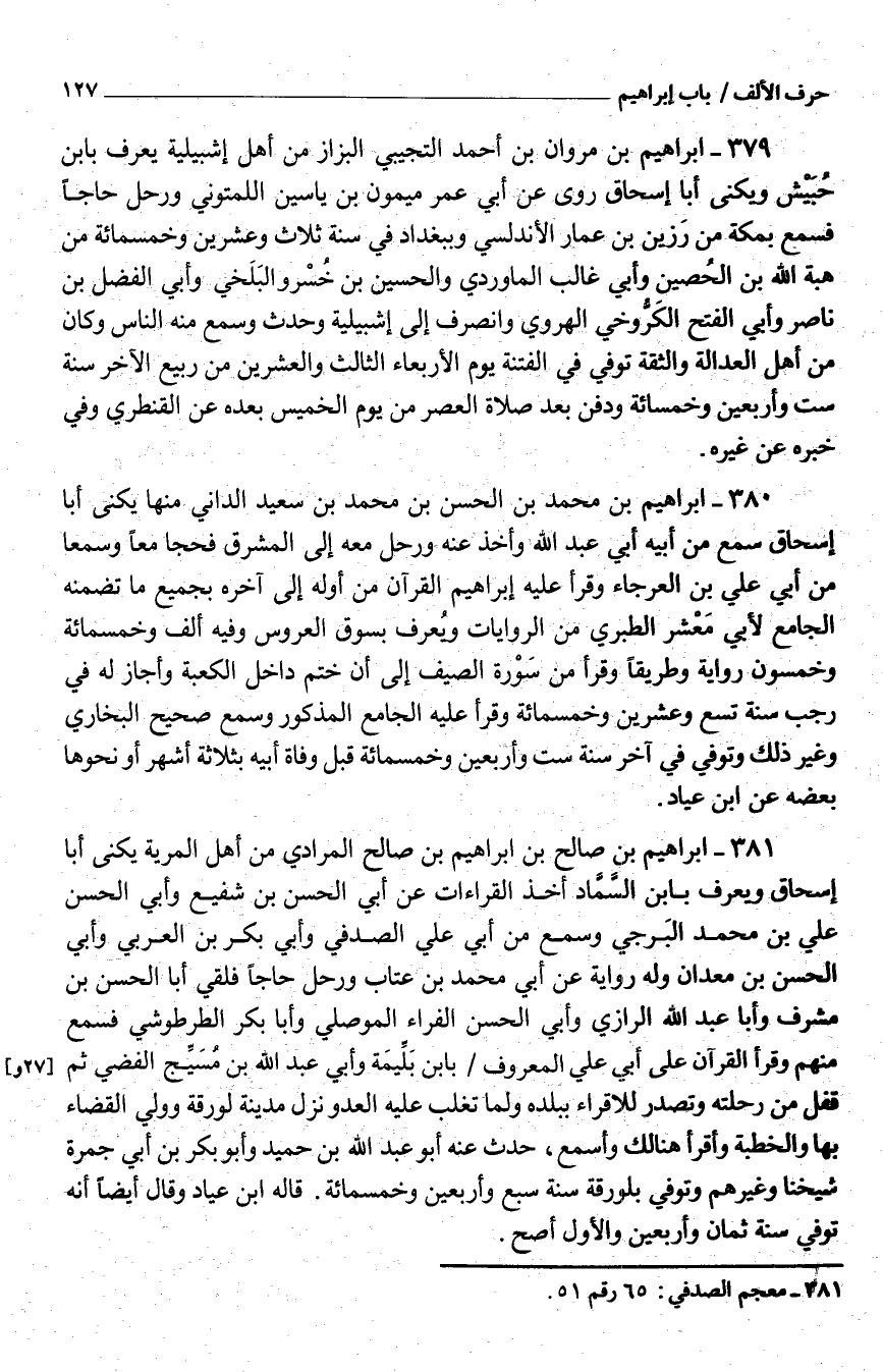380 - إِبْرَاهِيم بْن مُحَمَّد بْن الْحَسَن بْن مُحَمَّد بْن سَعِيد الداني مِنْهَا يكنى أَبَا إِسْحَاق سَمِعَ من أَبِيه أبي عَبْد اللَّه وَأخذ عَنْهُ ورحل مَعَه إِلَى الْمشرق فحجا مَعًا وسمعا من أبي عَلِيّ بْن العرجاء وَقَرَأَ عَلَيْهِ إِبْرَاهِيم الْقُرْآن من أَوله إِلَى آخِره بِجَمِيعِ مَا تضمنه الْجَامِع لأبي مَعْشر الطَّبَريّ من الرِّوَايَات ويُعرف بسوق الْعَرُوس وَفِيه ألف وَخَمْسمِائة وَخَمْسُونَ رِوَايَة وطريقًا وَقَرَأَ من سَوْرَةِ الصَّيف إِلَى أنَّ ختم دَاخل الْكَعْبَة وَأَجَازَ لَهُ فِي رَجَب سنة تسع وَعشْرين وَخَمْسمِائة وَقَرَأَ عَلَيْهِ الْجَامِع الْمَذْكُور وَسمع صَحِيح الْبُخَارِيّ وَغير ذَلِكَ وتُوُفيّ فِي آخر سنة ستٍّ وَأَرْبَعين وَخَمْسمِائة قَبْلَ وَفَاة أَبِيه بِثَلَاثَة أشهر أَوْ نَحْوهَا بعضه عَنِ ابْن عياد