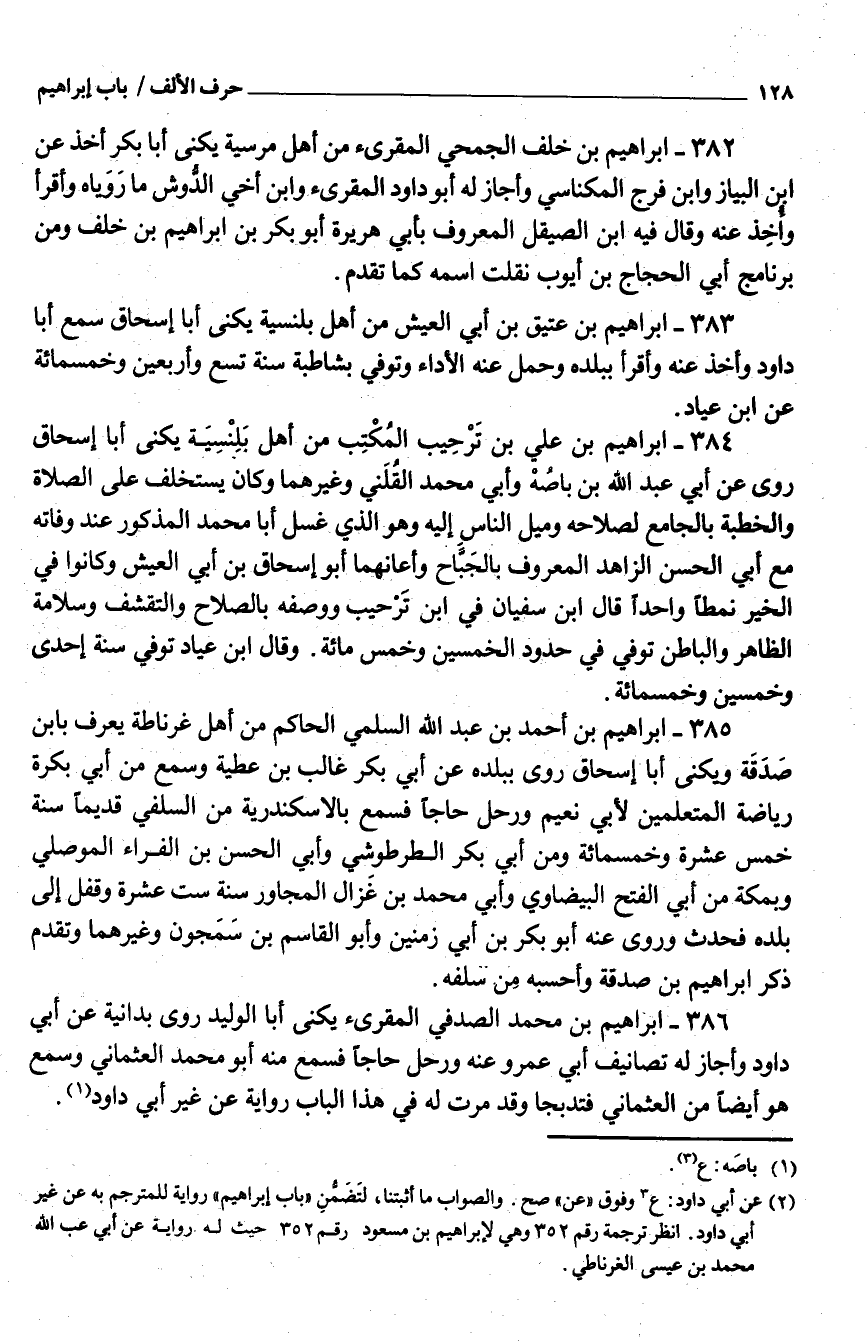 386 - إِبْرَاهِيم بْن مُحَمَّد الصَّدَفِي الْمُقْرِئ يكنى أَبَا الْوَلِيد روى بدانية عَنْ أبي دَاوُد وَأَجَازَ لَهُ تصانيف أبي عَمْرو عَنهُ ورحل حَاجا فَسمع مِنْهُ أَبُو مُحَمَّد العثماني وَسمع هُوَ أَيْضا من العثماني فتدبجا وَقد مرت لَهُ فِي هَذَا الْبَاب رِوَايَة عَنْ غَيْر أبي دَاوُد