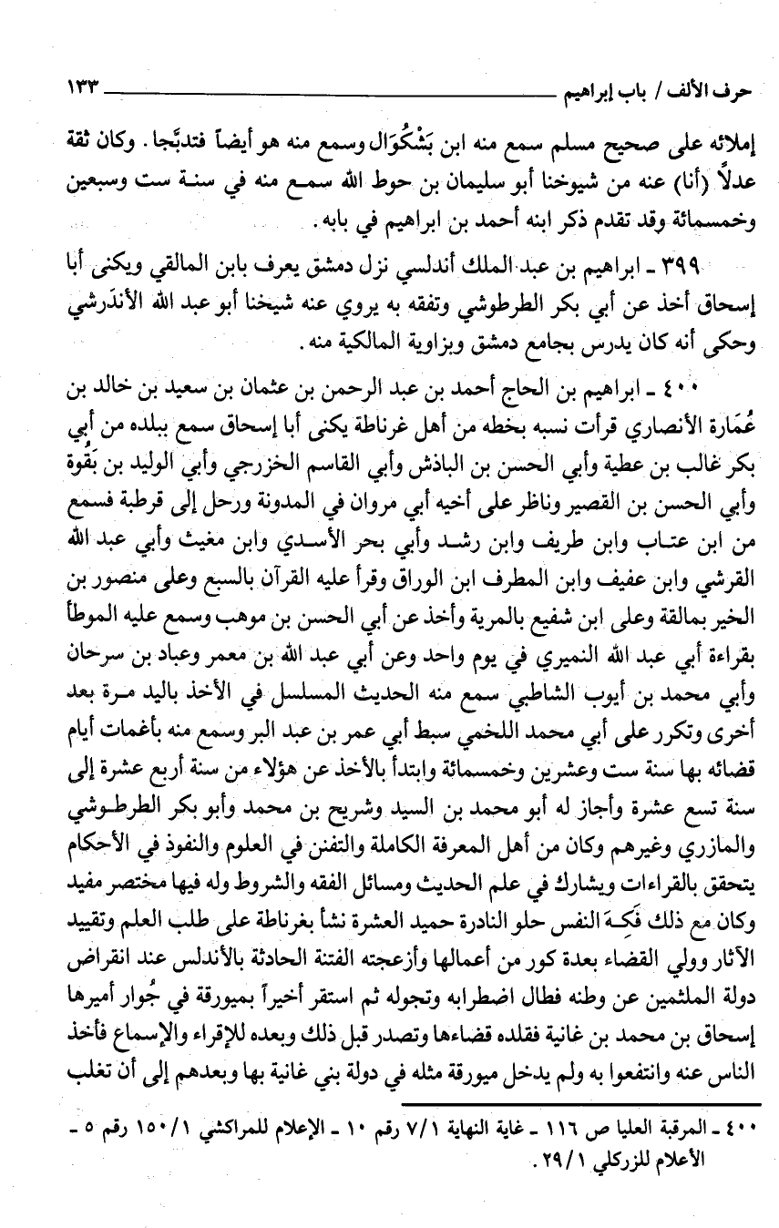 399 - إِبْرَاهِيم بْن عَبْد الْملك أندلسي نزل دمشق يعرف بِابْن المالقي ويكنى أَبَا إِسْحَاق أَخذ عَنْ أبي بَكْر الطرطوشي وتَفَقَّه بِهِ يروي عَنْهُ شَيخنَا أَبُو عَبْد اللَّه الأندَرشي وَحكى أَنَّهُ كَانَ يدرس بِجَامِع دمشق وبزاوية الْمَالِكِيَّة مِنْهُ
