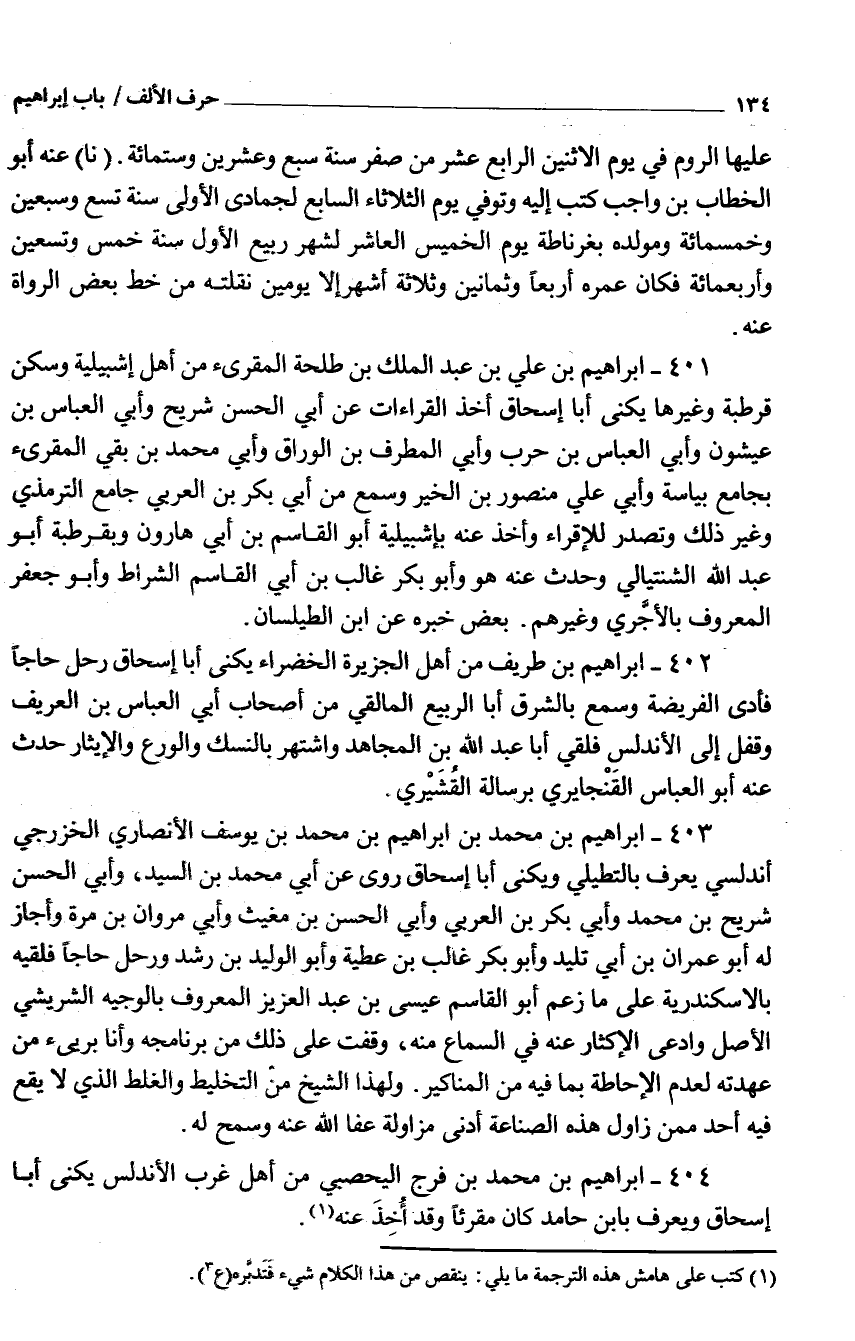 401 - إِبْرَاهِيم بن عَليّ بن عبد الْملك بْن طَلْحَة الْمُقْرِئ من أَهْل إشبيلية وَسكن قرطبة وَغَيرهَا يكنى أَبَا إِسْحَاق أَخذ الْقرَاءَات عَنْ أبي الْحَسَن شُرَيْح وَأبي الْعَبَّاس بْن عيشون وَأبي الْعَبَّاس بْن حَرْب وَأبي الْمطرف بن الْوراق وَأبي مُحَمَّد بن بَقِي الْمُقْرِئ بِجَامِع بياسة وَأبي عَليّ مَنْصُور بن الْخَيْر وَسمع من أبي بَكْر بْن الْعَرَبِيّ جَامع التِّرْمِذيّ وَغير ذَلِكَ وتصدر للإقراء وَأخذ عَنْهُ بإشبيلية أَبُو القَاسِم بْن أبي هَارُون وبقرطبة أَبُو عَبْد اللَّه الشنتيالي وحدَّث عَنْهُ هُوَ وَأَبُو بَكْر غَالب بْن أبي الْقَاسِم الشراط وَأَبُو جَعْفَر الْمَعْرُوف بالأجري وَغَيرهم بعض خَبره عَنِ ابْن الطيلسان