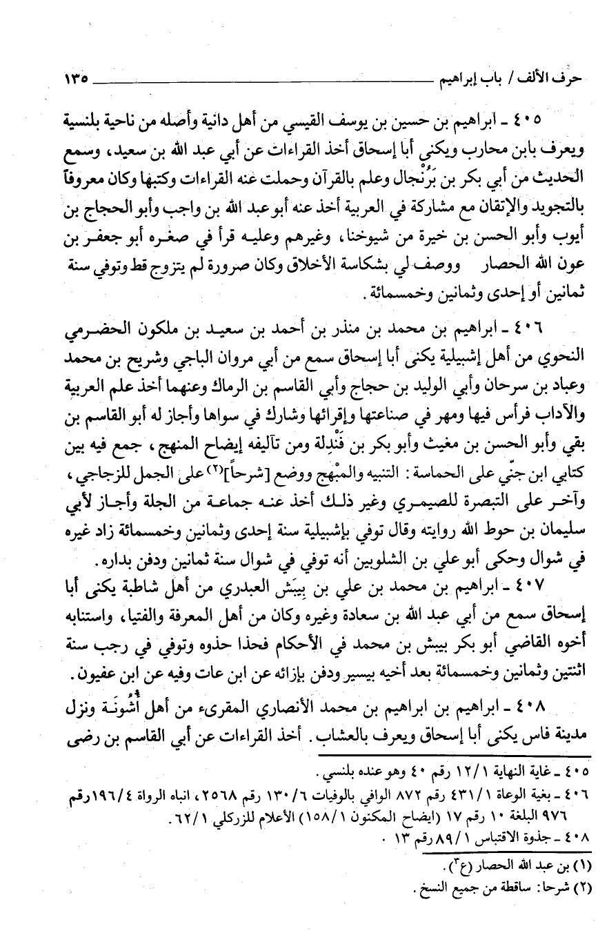 406 - إِبْرَاهِيم بْن مُحَمَّد بْن مُنْذر بْن أَحْمَد بْن سَعِيد بْن ملكون الحضْرميّ النَّحْويّ من أَهْل إشبيلية يكنى أَبَا إِسْحَاق سَمِعَ من أبي مَرْوَان الْبَاجِيّ وَشُرَيْح بْن مُحَمَّد وَعباد بْن سرحان وَأبي الْوَلِيد بْن حجاج وَأبي القَاسِم بْن الرماك وعنهما أَخذ علمُ الْعَرَبيَّة والآداب فرأس فِيهَا وَمهر فِي صناعتها وإقرائها وشارك فِي سواهَا وَأَجَازَ لَهُ أَبُو القَاسِم بْن بَقِي وَأَبُو الْحَسَن بْن مغيث وَأَبُو بَكْر بْن فَنْدَلة وَمن تآليفه إِيضَاح الْمنْهَج جمع فِيهِ بَيْنَ كتابي ابْن جنّي عَلَى الحماسة التَّنْبِيه والمبْهج وَوضع شرحًا عَلَى الْجمل للزجاجي وَآخر عَلَى التَّبْصِرَة للصيمري وَغير ذَلِكَ أَخذ عَنْهُ جمَاعَة من الجلة وَأَجَازَ لأبي سُلَيْمَان بْن حوط اللَّه رِوَايَته وَقَالَ تُوُفّي بإشبيلية سنة إِحْدَى وَثَمَانِينَ وَخَمْسمِائة زَاد غَيره فِي شوّال وَحكى أَبُو عَلِيّ بْن الشلوبين أَنه تُوُفّي فِي شوّال سنة ثَمَانِينَ ودُفِن بداره