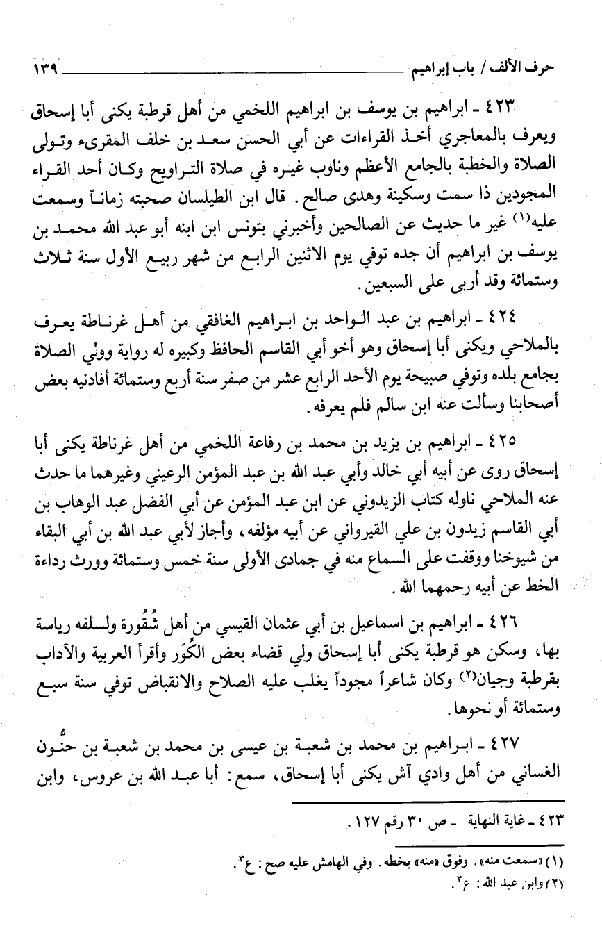 427 - إِبْرَاهِيم بْن مُحَمَّد بْن شُعْبَة بْن عِيسَى بْن مُحَمَّد بْن شُعْبَة بْن حنُّون الغساني من أَهْلَ وَادي آش يكنى أَبَا إِسْحَاق سَمِعَ أَبَا عَبْد اللَّه بْن عروس وَابْن