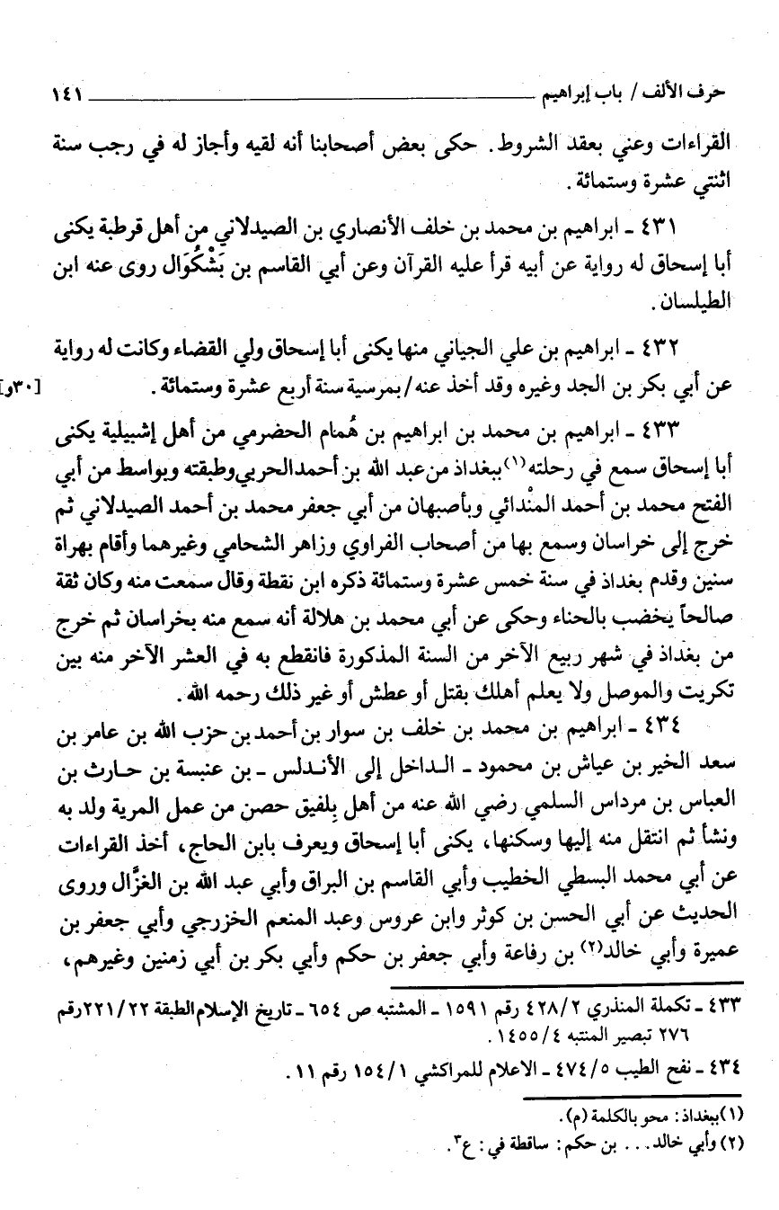 433 - إِبْرَاهِيم بْن مُحَمَّد بْن إِبْرَاهِيم بْن هُمام الحضْرميّ من أَهْلَ إشبيلية يكنى أَبَا إِسْحَاق سَمِعَ فِي رحلته بِبَغْدَاد من عَبْد اللَّه بْن أَحْمَد الْحَرْبِيّ وطبقته وبواسط من أبي الْفَتْح مُحَمَّد بْن أَحْمَد المنْدائي وبأصبهان من أبي جَعْفَر مُحَمَّد بْن أَحْمَد الصيدلاني ثُمَّ خَرَجَ إِلَى خُرَاسَان وَسمع بهَا من أَصْحَاب الفراوي وزاهر الشحامي وَغَيرهمَا وَأقَام بِهَرَاة سِنين وقدِم بَغْدَاد فِي سنة خمس عشرَة وستّمائة ذكره ابْن نقطة وَقَالَ سَمِعتُ مِنْهُ وَكَانَ ثِقَة صَالحا يخضب بِالْحِنَّاءِ وَحكى عَنْ أبي مُحَمَّد بْن هلالة أَنَّهُ سَمِعَ مِنْهُ بخراسان ثُمَّ خَرَجَ من بَغْدَاد فِي شهر ربيع الآخر من السَّنَة الْمَذْكُورَة فَانْقَطع بِهِ فِي الْعشْر الآخر مِنْهُ بَيْنَ تكريت والموصل وَلَا يَعْلَمُ أهلك بقتل أَوْ عَطش أَو غَيْر ذَلِكَ رَحمَه اللَّه