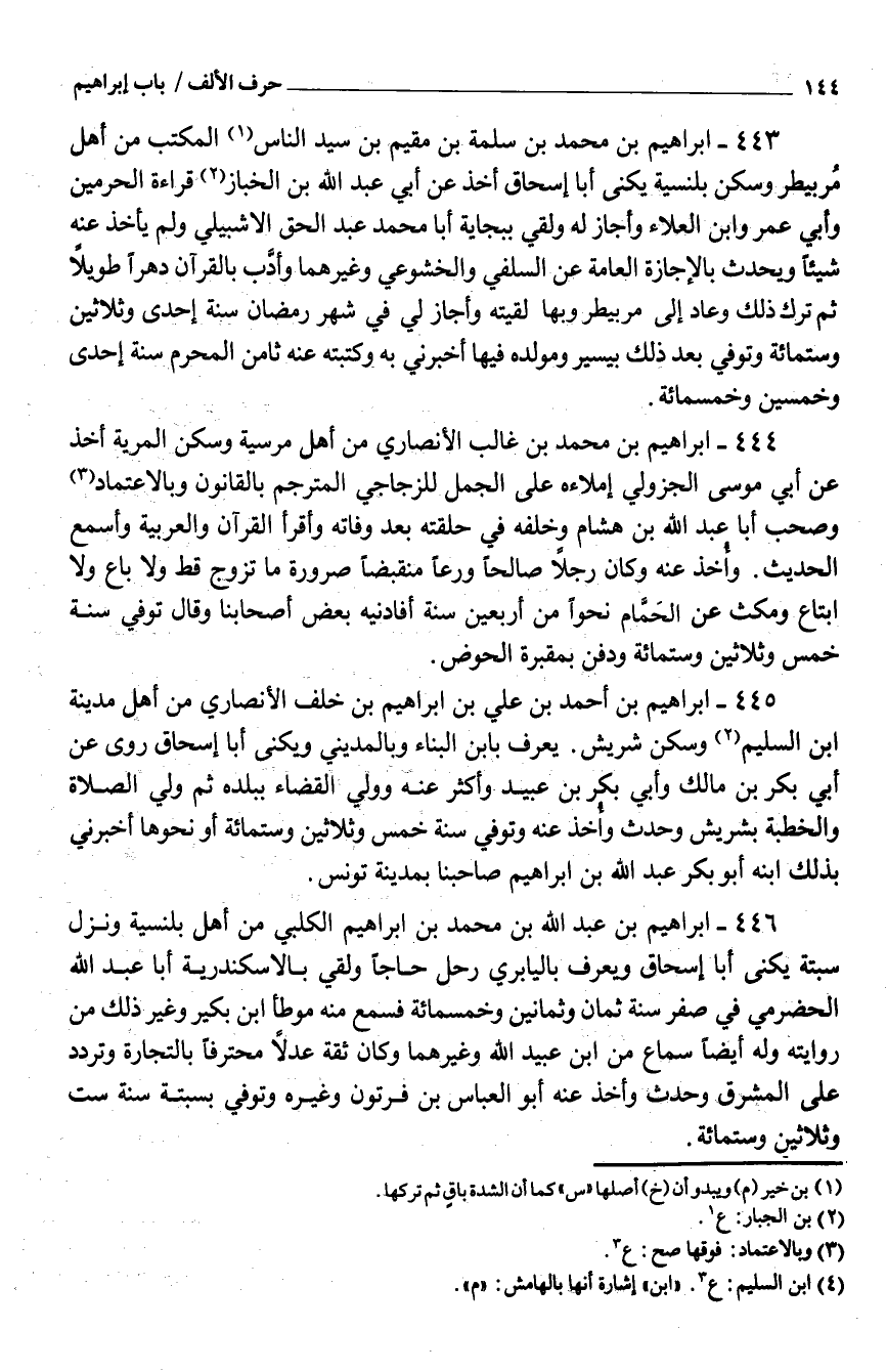 443 - إِبْرَاهِيم بن مُحَمَّد بن سَلَمَة بْن مُقيم بْن سيد النّاس الْمكتب من أَهْل مُربيطر وَسكن بلنسية يكنى أَبَا إِسْحَاق أَخذ عَنْ أبي عَبْد اللَّه بن الخباز قِرَاءَة الْحَرَمَيْنِ وَأبي عمر وَابْن الْعَلَاء وَأَجَازَ لَهُ وَلَقي ببجاية أَبَا مُحَمَّد عبد الْحق الاشبيلي وَلم يَأْخُذ عَنهُ شَيْئا وَيحدث بِالْإِجَازَةِ الْعَامَّة عَنِ السِّلَفيّ والخشوعي وَغَيرهمَا وأدَّب بِالْقُرْآنِ دهرًا طَويلا ثُمَّ ترك ذَلِكَ وَعَاد إِلَى مربيطر وَبهَا لَقيته وَأَجَازَ لي فِي شهر رَمَضَان سنة إِحْدَى وَثَلَاثِينَ وستّمائة وتُوُفيّ بَعْدَ ذَلِكَ بِيَسِير ومولده فِيهَا أَخْبرنِي بِهِ وكتبته عَنْهُ ثامن المُحَرَّم سنة إِحْدَى وَخمسين وَخَمْسمِائة