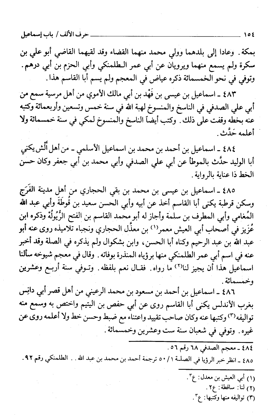 483 - إِسْمَاعِيل بْن عِيسَى بْن فَهْد بْن أبي مَالك الْأمَوِي من أَهْل مرسية سَمِعَ من أبي عَلِيّ الصَّدَفِي فِي النَّاسِخ والمنسوخ لهبة الله فِي سنة خمس وَتِسْعين وَأَرْبَعمِائَة وَكتبه عَنْهُ بِخَطِّهِ وقفت عَلَى ذَلِكَ وَكتب أَيْضا النَّاسِخ والمنسوخ لمكي فِي سنة خَمْسمِائَة وَلَا أعلمهُ حدَّث