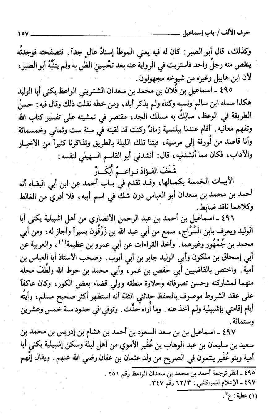 497 - اسماعيل بن بْن سَعْد السُّعُود بْن أَحْمَد بْن هِشَام بْن إِدْرِيس بْن مُحَمَّد بْن سَعِيد بْن سُلَيْمَان بْن عَبْد الوهّاب بْن عُفَير الْأمَوِي من أَهْل لبلة وَسكن إشبيلية يكنى أَبَا أُميَّة وَبَنُو عُفير ينتمون فِي الصَّرِيح من وَلَدِ عُثْمَان بْن عَفَّان رَضِيَ اللَّه عَنْهُمْ وَيُقَال إنَّهم