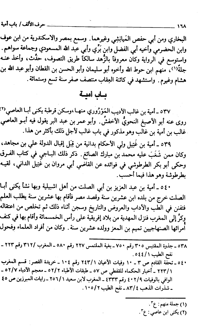 540 - أُميَّة بْن عبد الْعَزِيز بْن أبي الصَّلْت من أَهْل إشبيلية وَبهَا نَشأ يكنى أَبَا الصَّلْت خرج من بَلَده ابْن عشْرين سنة وَقصد مصر فَأَقَامَ بهَا عشْرين سنة يطْلب الْعلم فتفنن فِي الطِّبّ والآداب وَالْعرُوض والتاريخ وسجن أثْنَاء ذَلِكَ ثُمَّ تخلص من اعتقاله وكرَّ إِلَى الْمغرب فَنزل المهدية من بِلَاد إفريقية على رَأس الْخَمْسمِائَةِ وَأقَام بهَا فِي كنف أمرائها الصنهاجيين تَمِيم بْن الْمعز وَولده عشْرين سنة وَكَانَ من أَفْرَاد الْعلمَاء وفحول