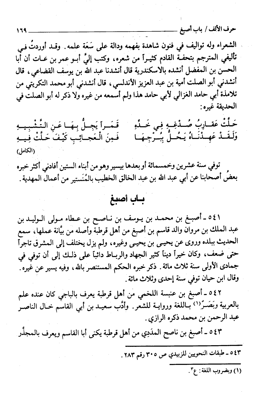 542 - أصبغ بْن عَنْبَسَة اللَّخْميّ من أَهْل قرطبة يعرف بالباجي كَانَ عِنْدَهُ علم بِالْعَرَبِيَّةِ وبَصَرٌ باللغة وَرِوَايَة للشعر وأدَّب سَعِيد بْن أبي القَاسِم خَال النَّاصِر عَبْد الرَّحْمَن بْن مُحَمَّد ذكره الرّازيّ