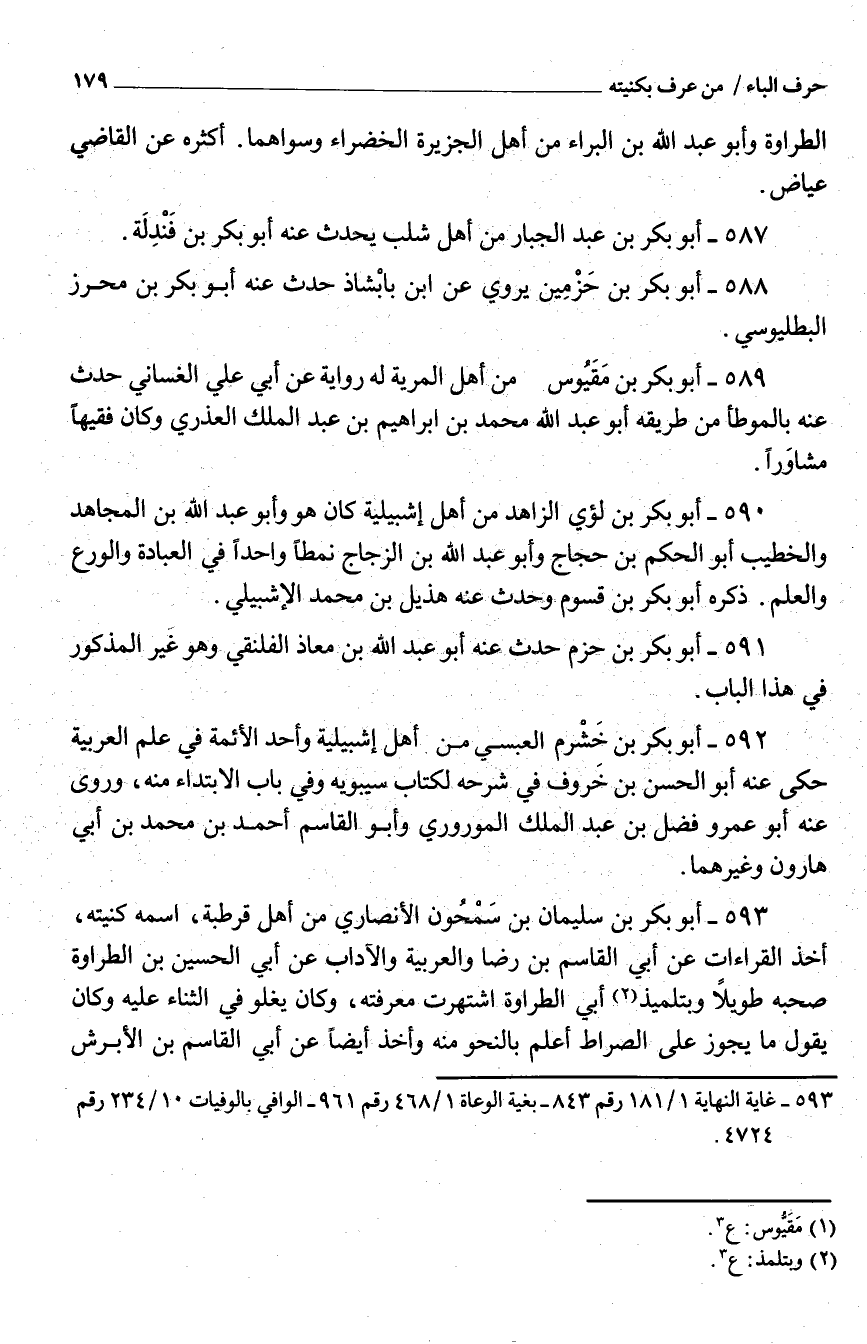 593 - أَبُو بَكْر بْن سُلَيْمَان بْن سَمْحُون الْأَنْصَارِيّ من أَهْل قرطبة اسْمه كنيته أَخذ الْقرَاءَات عَنْ أبي القَاسِم بْن رضَا والعربية والآداب عَنْ أبي الْحُسَيْن بْن الطراوة صَحبه طَويلا وبتلميذ أبي الطراوة اشتهرت مَعْرفَته وَكَانَ يغلو فِي الثَّنَاء عَلَيْهِ وَكَانَ يَقُولُ مَا يجوز عَلِيّ الصِّرَاط أعلم بالنحو مِنْهُ وَأخذ أَيْضا عَنْ أبي القَاسِم بْن الأبرش