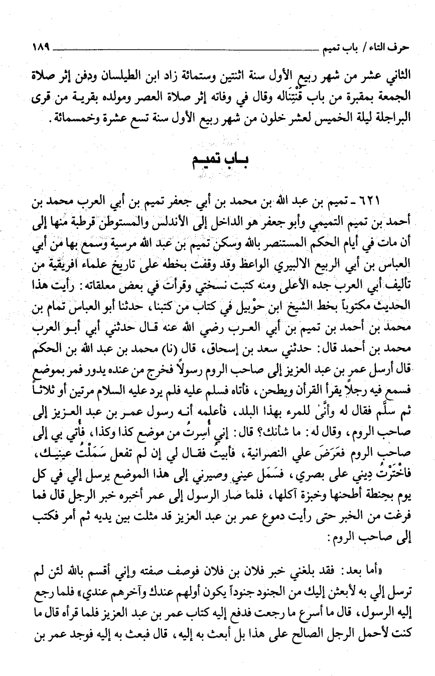 621 - تَمِيم بْن عَبْد اللَّه بْن مُحَمَّد بْن أبي جَعْفَر تَمِيم بْن أبي الْعَرَب مُحَمَّد بْن أَحْمَد بْن تَمِيم التّميميّ وَأَبُو جَعْفَر هُوَ الدَّاخِل إِلَى الأندلس والمستوطن قرطبة مِنْهَا إِلَى أنَّ مَاتَ فِي أيّام الحكم الْمُسْتَنْصر بِاللَّه وَسكن تَمِيم بْن عبد الله مرسية وَسمع بهَا من أبي الْعَبَّاس بْن أبي الرّبيع الإلبيري الْوَاعِظ وَقد وقفت بِخَطِّهِ عَلَى تَارِيخ عُلَمَاء إفريقية من تأليف أبي الْعَرَب جَدّه الْأَعْلَى وَمِنْه كتبت نُسْخَتي وقرأت فِي بَعْض معلقاته رَأَيْت هَذَا الحَدِيث مَكْتُوبًا بِخَط الشَّيْخ ابْن حوْبيل فِي كتاب من كتبنَا حَدَّثَنَا أَبُو الْعَبَّاس تَمام بْن مُحَمَّد بْن أَحْمَد بْن تَمِيم بْن أبي الْعَرَب رَضِيَ اللَّه عَنْهُ قَالَ حَدَّثَنِي أبي أَبُو الْعَرَب مُحَمَّد بْن أَحْمَد قَالَ حَدَّثَنِي سَعْد بْن إِسْحَاق قَالَ نَا مُحَمَّد بْن عَبْد اللَّه بْن الحكم قَالَ أرسل عُمَر بْن عبد الْعَزِيز إِلَى صَاحب الرّوم رَسُولا فَخرج من عِنْده يَدُور فَمر بِموضع فَسمع فِيهِ رَجُلاً يَقْرَأ الْقُرْآن ويطحن فَأَتَاهُ فَسلم عَلَيْهِ فَلم يرد عَلَيْهِ السّلام مرَّتَيْنِ أَوْ ثَلَاثًا ثُمَّ سلم فَقَالَ لَهُ وأنَّى للمرء بِهَذَا الْبَلَد فَأعلمهُ أَنَّهُ رَسُول عُمَر بْن عبد الْعَزِيز إِلَى صَاحب الرّوم وَقَالَ لَهُ مَا شَأْنك قَالَ إِنِّي أُسرتُ من مَوضِع كَذَا وَكَذَا فأُتي بِي إِلَيّ صَاحب الرّوم فَعَرَضَ عَلَى النَّصْرَانِيَّة فأبيتُ فَقَالَ لي إِن لَمْ تفعل سَمَلْتُ عَيْنَيْك فاخْتَرْتُ ديني عَلَى بَصرِي فَسَمل عَيْني وصيرني إِلَى هَذَا الْموضع يُرْسل إِلَى فِي كلّ يَوْمَ بحِنطة أطحنها وخبزة آكلها فَلَمّا صَار الرَّسُول إِلَى عُمَر أخبرهُ خبر الرَّجُل قَالَ فَمَا فرغت من الْخَبَر حَتَّى رَأَيْت دموع عُمَر بْن عبد الْعَزِيز قَدْ مثلت بَيْنَ يَدَيِهِ ثُمَّ أَمر فَكتب إِلَى صَاحب الرّوم