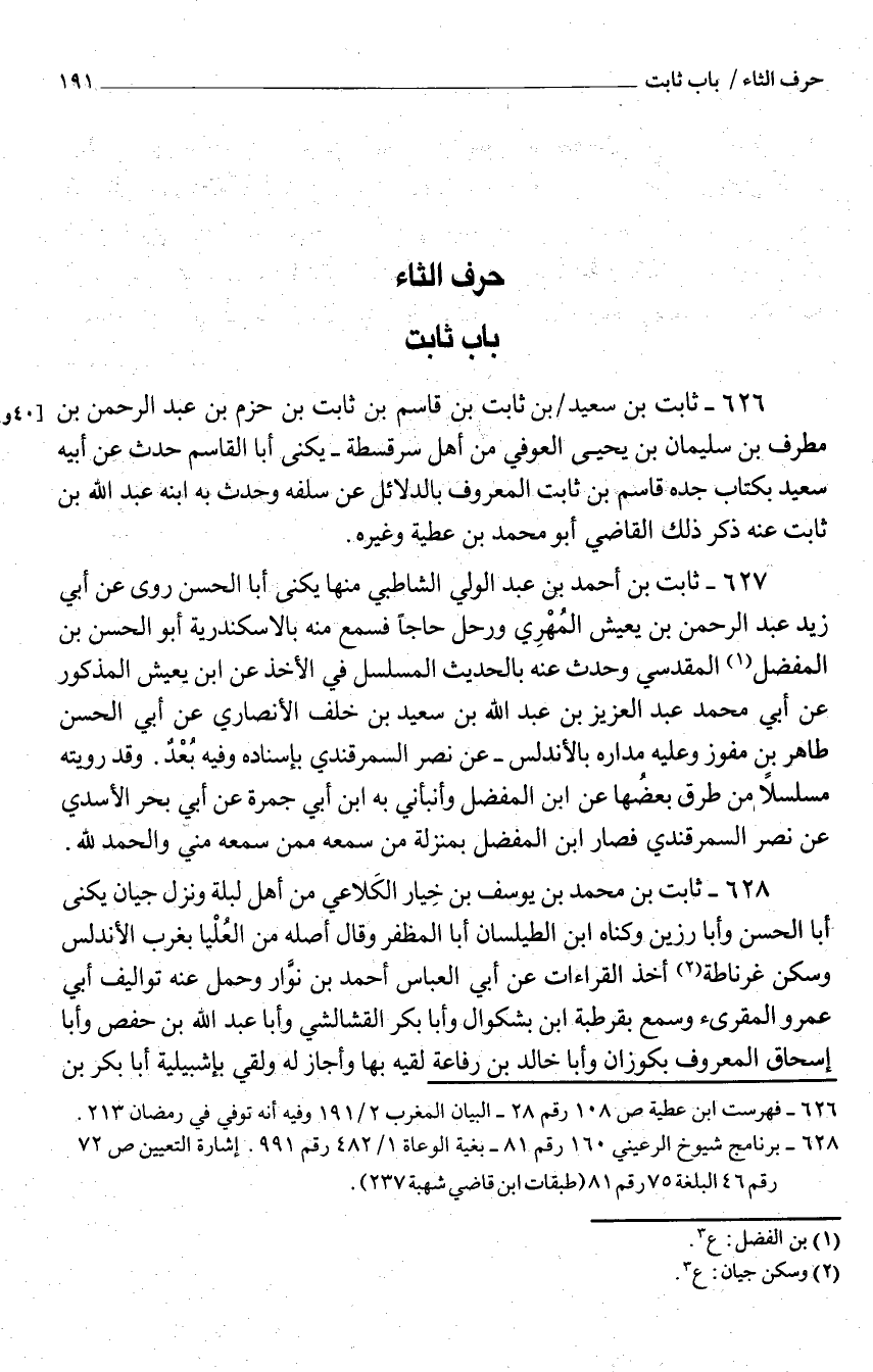 626 - ثَابت بْن سَعِيد بْن ثَابت بْن قَاسم بْن ثَابت بْن حزم بن عبد الرَّحْمَن بن ومطرف بْن سُلَيْمَان بْن يحيى الْعَوْفِيّ من أَهْلَ سرقسطة يكنى أَبَا القَاسِم حدَّث عَنْ أَبِيه سَعِيد بِكِتَاب جَدّه قَاسم بْن ثَابت الْمَعْرُوف بالدلائل عَنْ سلفه وحدَّث بِهِ ابْنه عَبْد اللَّه بْن ثَابت عَنْهُ ذَكَرَ ذَلِكَ القَاضِي أَبُو مُحَمَّد بْن عَطِيَّة وَغَيره