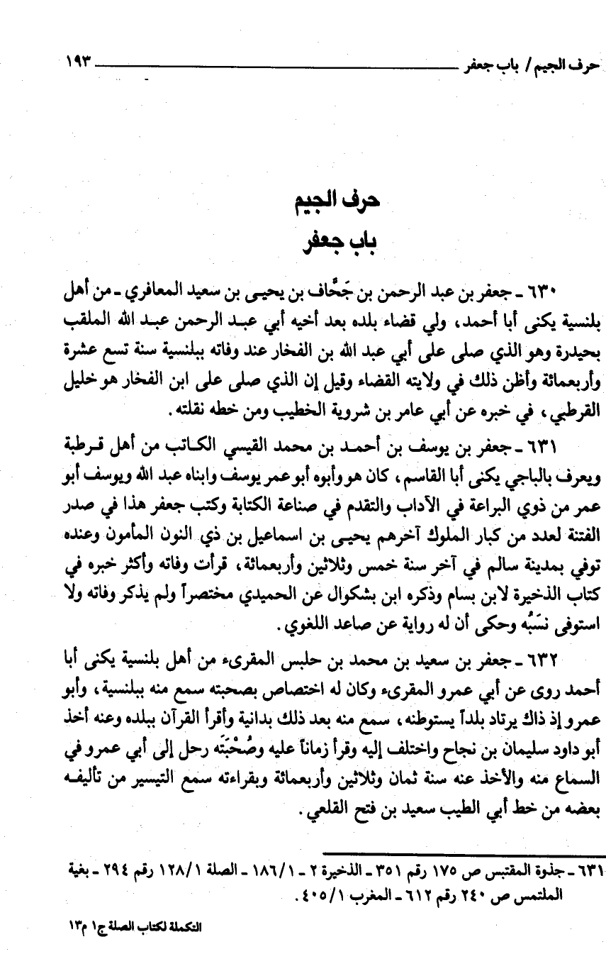 630 - جَعْفَر بْن عَبْد الرَّحْمَن بْن جحاف بْن يحيى بْن سَعِيد الْمعَافِرِي من أَهْلَ بلنسية يكنى أَبَا أَحْمَد وُلّي قَضَاء بَلَده بَعْدَ أَخِيه أبي عَبْد الرَّحْمَن عَبْد اللَّه الملقب بحيدرة وَهُوَ الَّذِي صلّى عَلَى أبي عَبْد اللَّه بْن الفخار عِنْدَ وَفَاته ببلنسية سبع تسع عشرَة وَأَرْبَعمِائَة وأظن ذَلِكَ فِي ولَايَته الْقَضَاء وَقيل إِن الَّذِي صلّى عَلَى ابْن الفخار هُوَ خَلِيل القُرْطُبيّ فِي خَبره عَنْ أبي عَامر بْن شرويه الْخَطِيب وَمن خطه نقلته