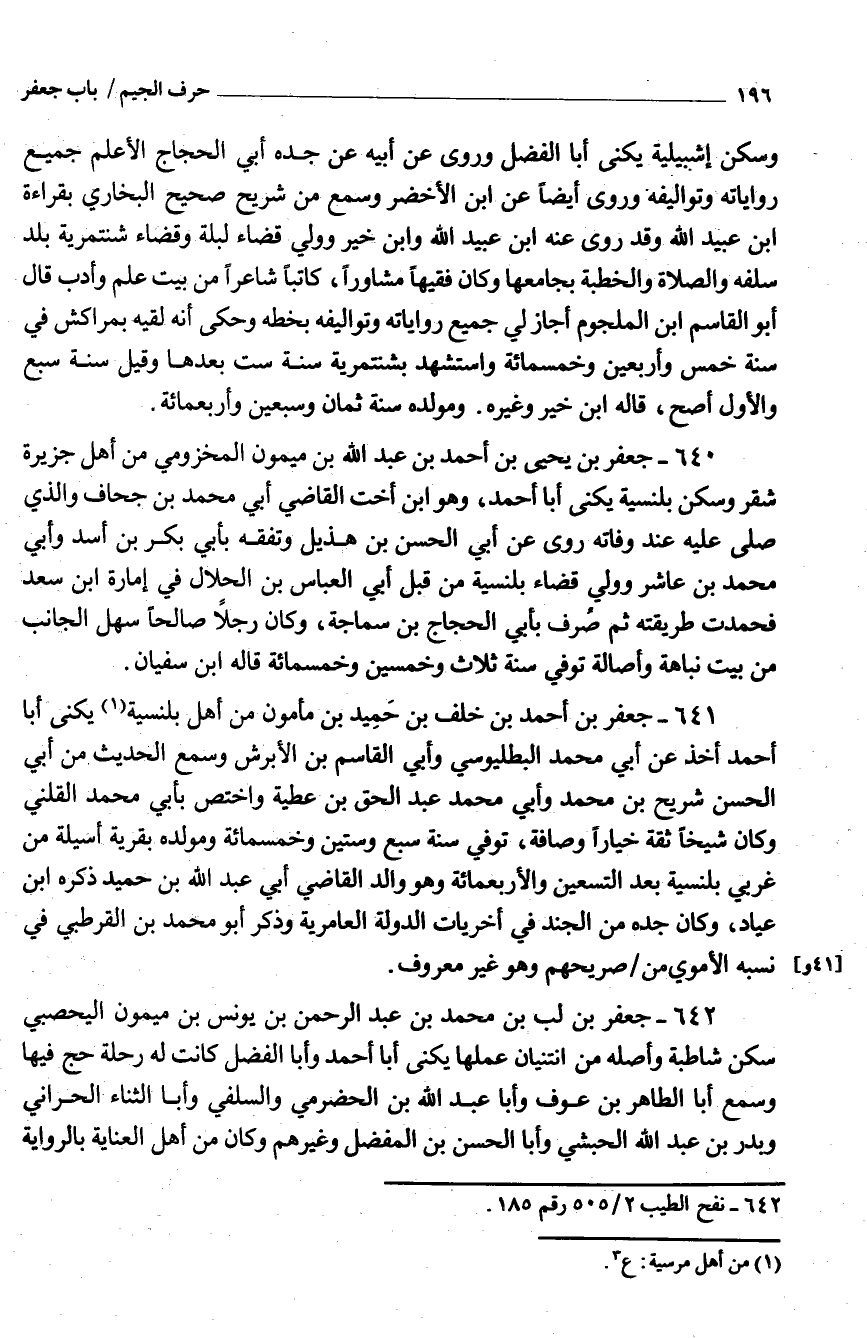 641 - جَعْفَر بْن أَحْمَد بْن خَلَف بْن حَمِيد بْن مَأْمُون من أَهْل بلنسِيَّة يكنى أَبَا أَحْمَد أَخذ عَنْ أبي مُحَمَّد البطليوسي وَأبي القَاسِم بْن الأبرش وَسمع الحَدِيث من أبي الْحَسَن شُرَيْح بْن مُحَمَّد وَأبي مُحَمَّد عَبْد الْحق بْن عَطِيَّة واختص بِأبي مُحَمَّد القلني وَكَانَ شَيخا ثِقَة خيارا وصافة توفّي سنة سبع وَسِتِّينَ وَخَمْسمِائة ومولده بقرية أسيلة من غربي بلنسية بعد التسعين والأربعمائة وَهُوَ وَالِد القَاضِي أبي عَبْد اللَّه بْن حُمَيْد ذكره ابْن عياد وَكَانَ جَدّه من الْجند فِي أخريات الدّولة العامرية وَذَكَرَ أَبُو مُحَمَّد بْن القُرْطُبيّ فِي نسبه الْأمَوِي من صريحهم وَهُوَ غَيْر مَعْرُوف