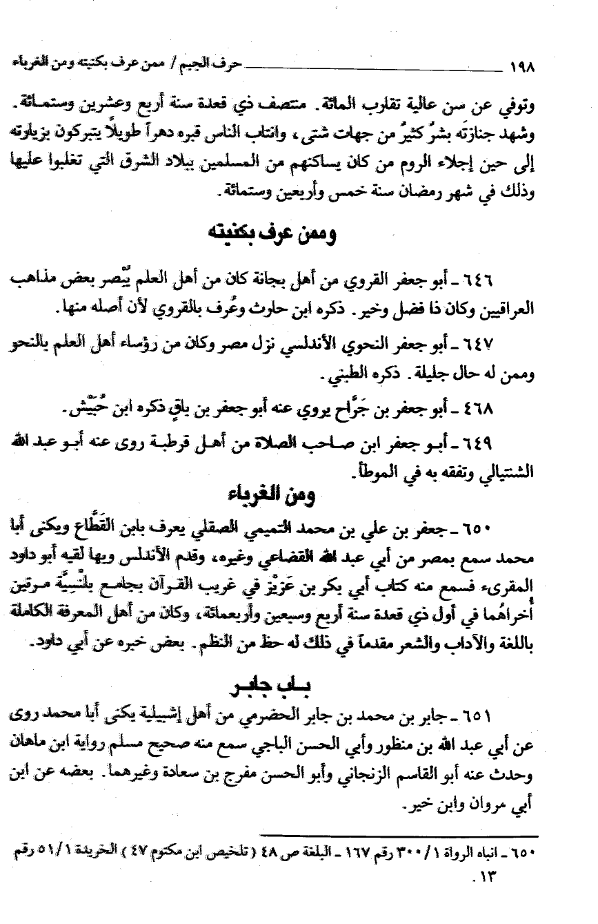 650 - جَعْفَر بْن عَلِيّ بْن مُحَمَّد التّميميّ الصّقليّ يعرف بِابْن القَطَّاع ويكنى أَبَا مُحَمَّد سَمِعَ بِمصْر من أبي عَبْد اللَّه الْقُضَاعِي وَغَيره وقدِم الأندلس وَبهَا لقِيه أَبُو دَاوُد المقرىء فَسمع مِنْهُ كتاب أبي بَكْر بن عَزِيز فِي غَرِيب الْقُرْآن بِجَامِع بلنسِيَّة مرَّتَيْنِ أُخراهُما فِي أول ذِي قعدة سنة أَربع وَسبعين وَأَرْبَعمِائَة وَكَانَ من أَهْلِ الْمعرفَة الْكَامِلَة باللغة والآداب وَالشعر مقدما فِي ذَلِكَ لَهُ حَظّ من النّظم بَعْض خَبره عَنْ أبي دَاوُد