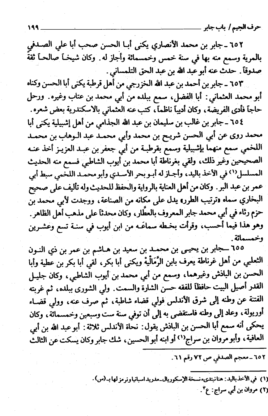 652 - جَابِر بْن مُحَمَّد الْأَنْصَارِيّ يكنى أَبَا الْحَسَن صحب أَبَا عَلِيّ الصَّدَفِي بالمرية وَسمع مِنْهُ بهَا فِي سنة خمس وَخَمْسمِائة وَأَجَازَ لَهُ وَكَانَ شَيخا صَالحا ثِقَة صَدُوقًا حدَّث عَنْهُ أَبُو عَبْد اللَّه بْن عَبْد الْحق التلمساني