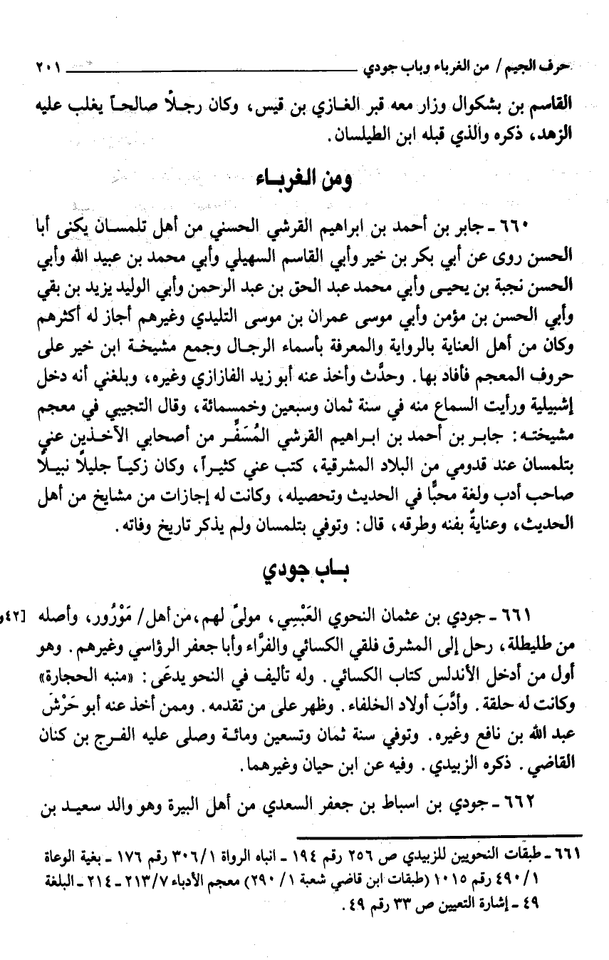 661 - جودي بْن عُثْمَان النَّحْويّ العَبْسِي مولى لَهُمْ من أَهْل مورور وَأَصله وَمن طليطلة رَحل إِلَى الْمشرق فلقي الْكسَائي والفرَّاء وَأَبا جَعْفَر الرُّؤَاسِي وَغَيرهم وَهُوَ أول من أَدخل الأندلس كتاب الْكسَائي وَله تأليف فِي النَّحْو يدعَى مُنَبّه الْحِجَارَة وَكَانَت لَهُ حَلقَة وأدَّبَ أَوْلَاد الْخُلَفَاء وَظهر عَلَى من تقدمه وَمِمَّنْ أَخذ عَنْهُ أَبُو حَرْشَ عَبْد اللَّه بْن نَافِع وَغَيره وتُوُفيّ سنة ثَمَان وَتِسْعين وَمِائَة وَصلى عَلَيْهِ الفَرَج بْن كنان القَاضِي ذكره الزَّبِيديّ وَفِيه عَنِ ابْن حَيَّان وَغَيرهمَا