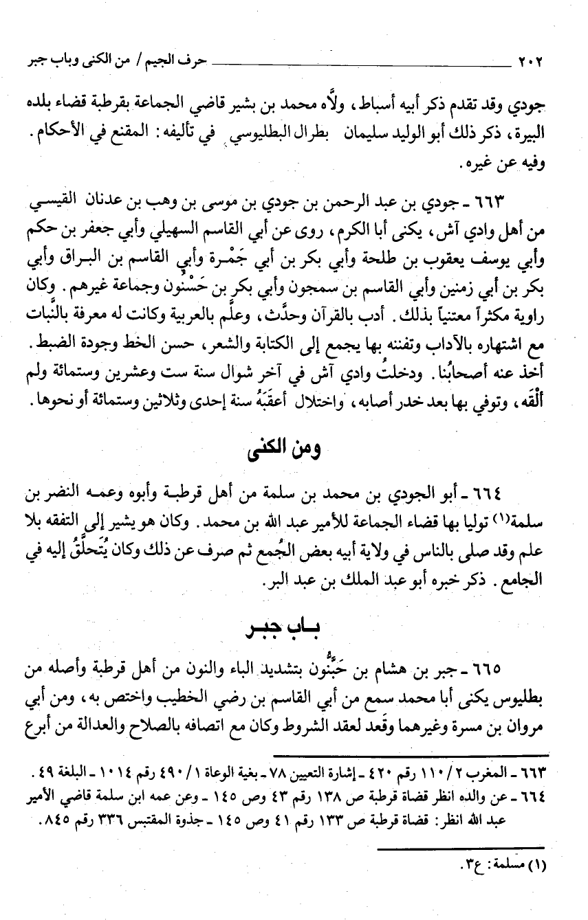 664 - أَبُو الجودي بْن مُحَمَّد بْن سَلَمَة من أَهْل قرطبة وَأَبوهُ وَعَمه النَّضر بن سَلمَة توليا بهَا قَضَاء الْجَمَاعَة للأمير عَبْد اللَّه بْن مُحَمَّد وَكَانَ هُوَ يُشِير إِلَى التفقه بِلَا عَلَمُ وَقد صلّى بِالنَّاسِ فِي ولَايَة أَبِيه بَعْض الجُمع ثُمَّ صرف عَنْ ذَلِكَ وَكَانَ يُتحَّلقُ إِلَيْهِ فِي الْجَامِع ذَكَرَ خَبره أَبُو عَبْد الْملك بْن عَبْد الْبر
