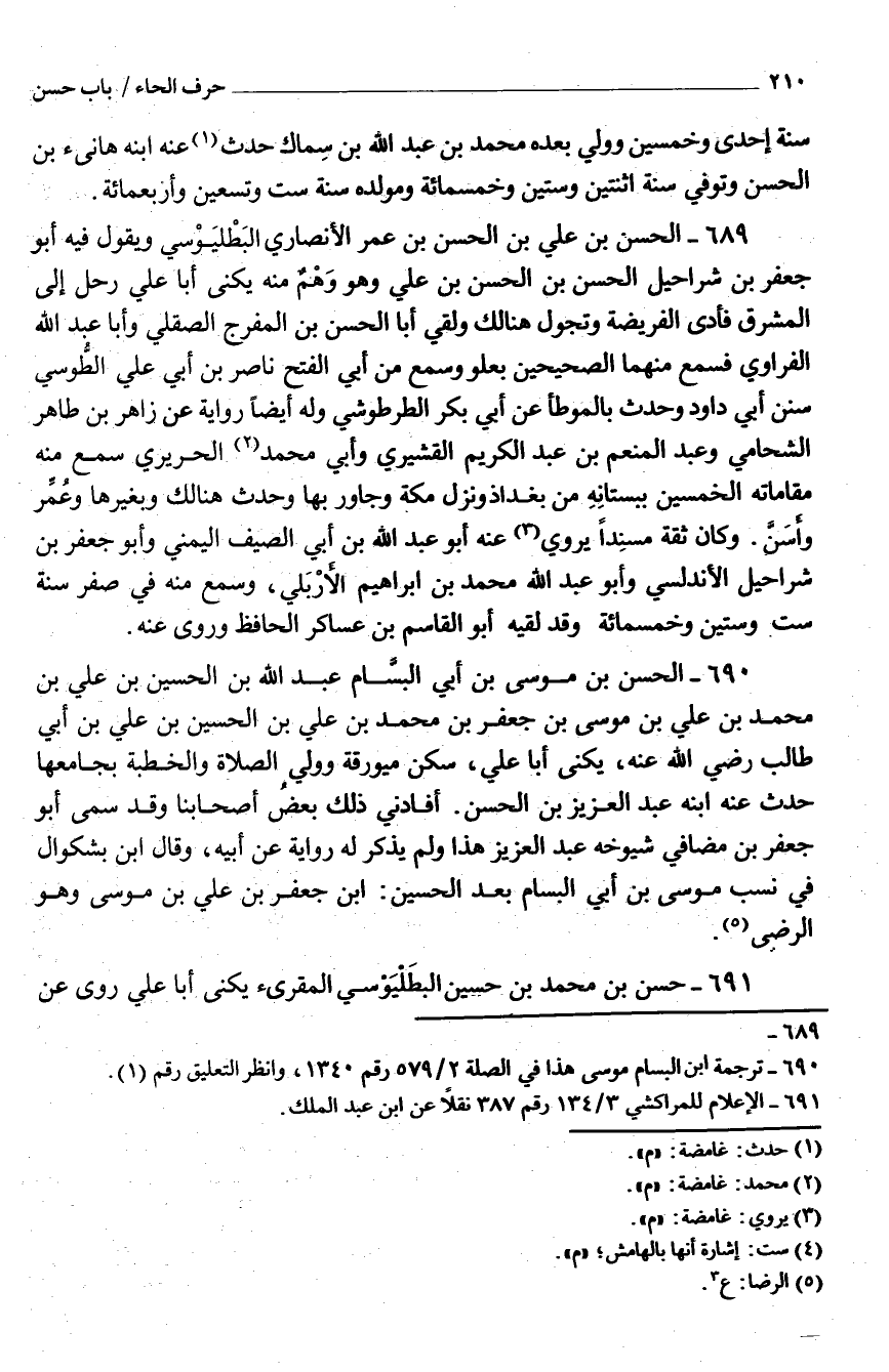 690 - الْحَسَن بْن مُوسَى بْن أبي البسَّام عَبْد اللَّه بْن الْحُسَيْن بْن عَلِيّ بْن مُحَمَّد بْن عَلِيّ بْن مُوسَى بْن جَعْفَر بْن مُحَمَّد بْن عَلِيّ بْن الْحُسَيْن بْن عَلِيّ بْن أبي طَالِب رَضِي الله عَنهُ يكنى أباا عَلِيّ سكن ميورقة وَولي الصَّلاة وَالْخطْبَة بجامعها حدَّث عَنْهُ ابْنه عبد الْعَزِيز بْن الْحَسَن أفادني ذَلِكَ بَعْضُ أَصْحَابنَا وَقد سمى أَبُو جَعْفَر بْن مضافي شُيُوخه عبد الْعَزِيز هَذَا وَلم يذكر لَهُ رِوَايَة عَنْ أَبِيه وَقَالَ ابْن بشكوال فِي نسب مُوسَى بْن أبي البسام بَعْدَ الْحُسَيْن ابْن جَعْفَر عَلِيّ بْن مُوسَى وَهُوَ الرضى