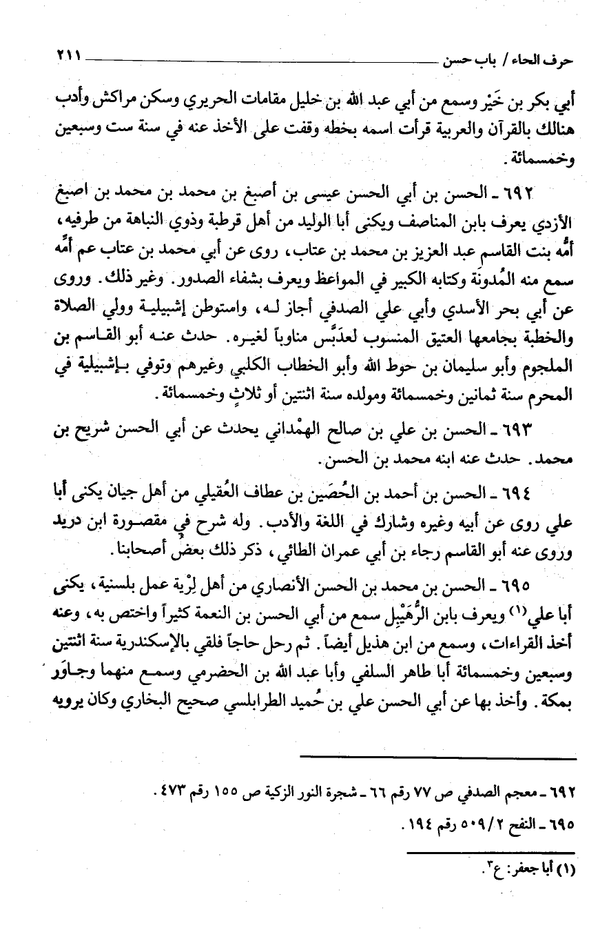 695 - الْحَسَن بْن مُحَمَّد بْن الْحَسَن الْأَنْصَارِيّ من أَهْل لِرْية عمل بلنسِيَّة يكنى أَبَا عَلِيّ وَيعرف بِابْن الرهيبل سَمِعَ من أبي الْحَسَن بْن النِّعْمَة كثيرا واختص بِهِ وَعنهُ أَخذ الْقرَاءَات وَسمع من ابْن هُذَيْل أَيْضا ثُمَّ رَحل حَاجا فلقي بالإسكندرية سنة اثْنَتَيْنِ وَسبعين وَخَمْسمِائة أَبَا طَاهِر السِّلَفيّ وَأَبا عَبْد اللَّه بْن الحضْرميّ وَسمع مِنْهُمَا وجاوَر بِمَكَّة وَأخذ بهَا عَنْ أبي الْحَسَن عَلِيّ بْن حُمَيْد الطرابلسي صَحِيح الْبُخَارِيّ وَكَانَ يرويهِ