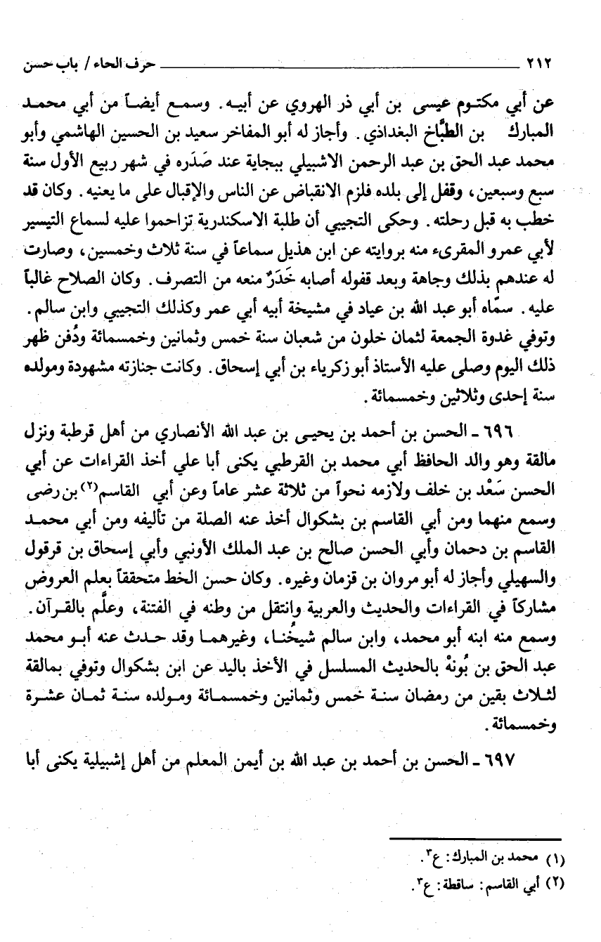 696 - الْحَسَن بْن أَحْمَد بْن يحيى بْن عَبْد اللَّه الْأَنْصَارِيّ من أَهْل قرطبة وَنزل مالقة وَهُوَ وَالِد الْحَافِظ أبي مُحَمَّد بْن القُرْطُبيّ يكنى أَبَا عَلِيّ أَخذ الْقرَاءَات عَنْ أبي الْحَسَن سَعْد بْن خَلَف ولازمه نَحوا من ثَلَاثَة عَشْر عَاما وَعَن أبي القَاسِم بْن رضى وَسمع مِنْهُمَا وَمن أبي القَاسِم بْن بشكوال أَخذ عَنهُ الصِّلَة من تأليفه وَمن أبي مُحَمَّد القَاسِم بْن دحمان وَأبي الْحَسَن صَالح بْن عَبْد الْملك الأونبي وَأبي إِسْحَاق بْن قرقول والسهيلي وَأَجَازَ لَهُ أَبُو مَرْوَان بْن قزمان وَغَيره وَكَانَ حَسَن الْخط متحققًا بِعلم الْعرُوض مشاركًا فِي الْقرَاءَات والْحَدِيث والعربية وانتقل من وَطنه فِي الْفِتْنَة وعلَّم بِالْقُرْآنِ وَسمع مِنْهُ ابْنه أَبُو مُحَمَّد وَابْن سَالم شيخُنا وَغَيرهمَا وَقد حدَّث عَنْهُ أَبُو مُحَمَّد عَبْد الْحق بْن بُونْه بِالْحَدِيثِ المسلسل فِي الْأَخْذ بِالْيَدِ عَنِ ابْن بشكوال وتُوُفيّ بمالقة لثلاث بَقينَ من رَمَضَان سنة خمس وَثَمَانِينَ وَخَمْسمِائة ومولده سنة ثَمَان عشرَة وَخَمْسمِائة