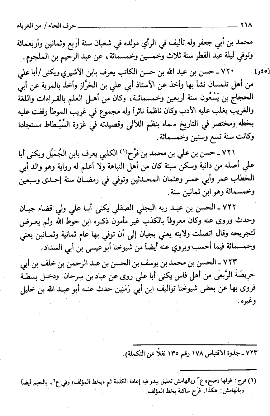 721 - حَسَن بْن عَلِيّ بْن مُحَمَّد بْن فَرح الْكَلْبِيّ يعرف بِابْن الجُمَيِّل ويكنى أَبَا عَلِيّ أَصله من دانية وَسكن سبتة كَانَ من أَهْل النباهة وَلَا أعلم لَهُ رِوَايَة وَهُوَ وَالِد أبي الخَطَّاب عُمَر وَأبي عُمَر وَعُثْمَان الْمُحدثين وتُوُفيّ فِي رَمَضَان سنة إِحْدَى وَسبعين وَخَمْسمِائة وَهُوَ ابْن ثَمَانِينَ سنة