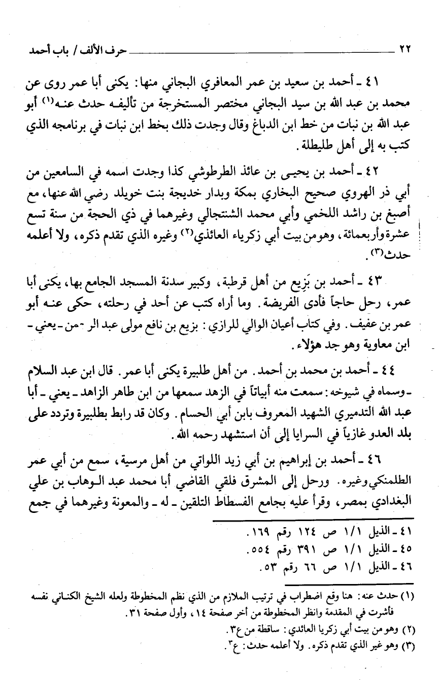42 - أَحْمَد بْن يحيى بْن عَائِذ الطرطوشي كَذَا وجدت اسْمه فِي السامعين من أَبِي ذَر الهَرَويّ صَحِيح الْبُخَارِيّ بِمَكَّة وبدار خَدِيجَة بِنْت خويلد رَضِيَ اللَّه عَنْهَا مَعَ أصبغ بْن رَاشد اللَّخْميّ وَأبي مُحَمَّد الشنتجالي وَغَيرهمَا فِي ذِي الحجّة من سنة تسع عشرَة وَأَرْبَعمِائَة وَهُوَ من بَيت أبي زَكَرِيَّاء العائذي وَغَيره الَّذِي تَقَدَّمَ ذكره وَلَا أعلمهُ حدَّث