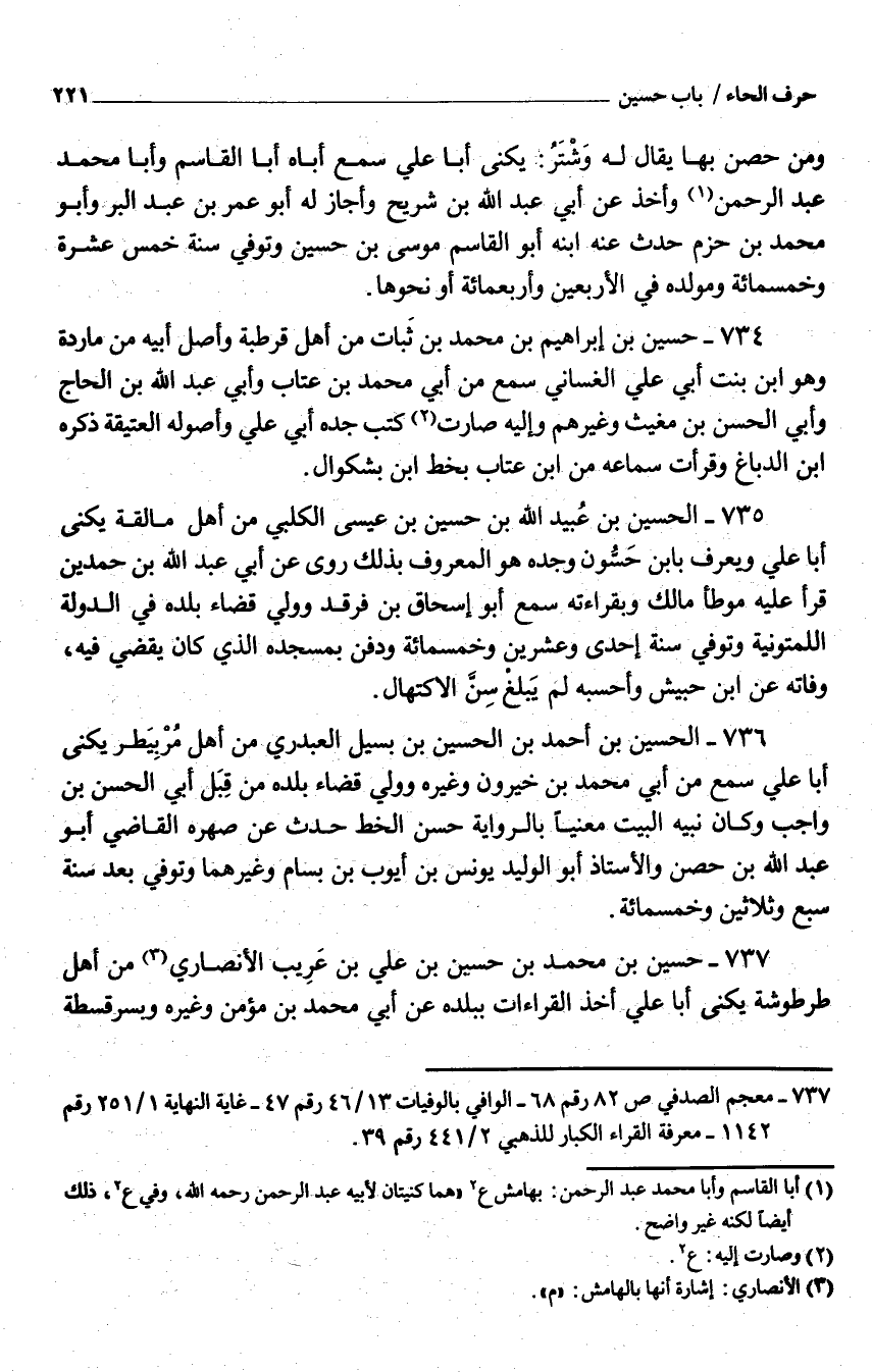 737 - حُسَيْن بْن مُحَمَّد بْن حُسَيْن بْن عَلِيّ بْن عَريب الْأَنْصَارِيّ من أَهْلَ طرطوشة يكنى أَبَا عَلِيّ أَخذ الْقرَاءَات بِبَلَدِهِ عَنْ أبي مُحَمَّد بْن مُؤمن وَغَيره وبسرقسطة