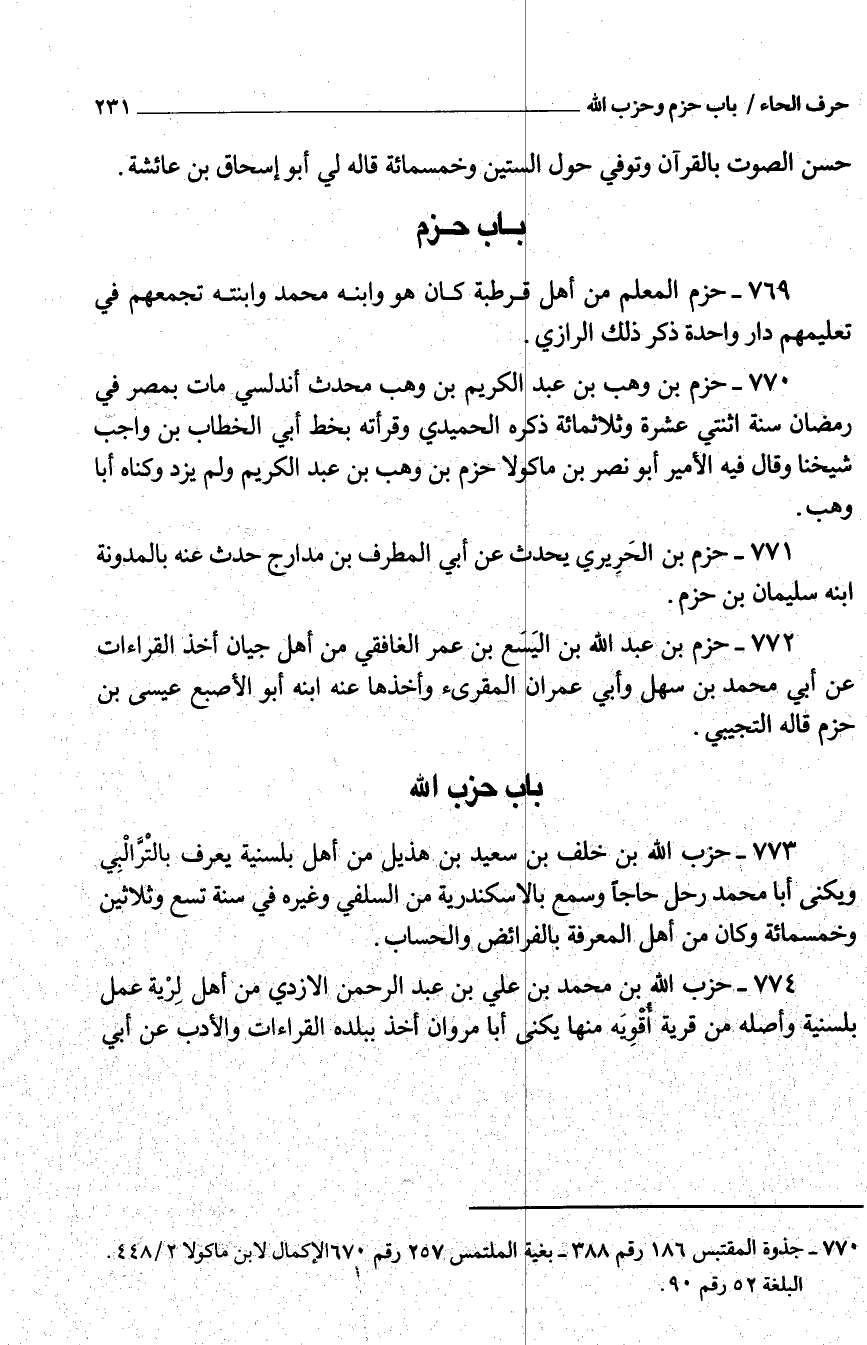 773 - حزب اللَّه بْن خَلَف بْن سَعِيد بْن هُذَيْل من أَهْل بلسنية يعرف بالترالبي ويُكَنَّى أَبَا مُحَمَّد رَحل حَاجا وَسمع بالإسكندرية من السِّلَفيّ وَغَيره فِي سنة تسع وَثَلَاثِينَ وَخَمْسمِائة وَكَانَ من أَهْل الْمعرفَة بالفرائض والحساب
