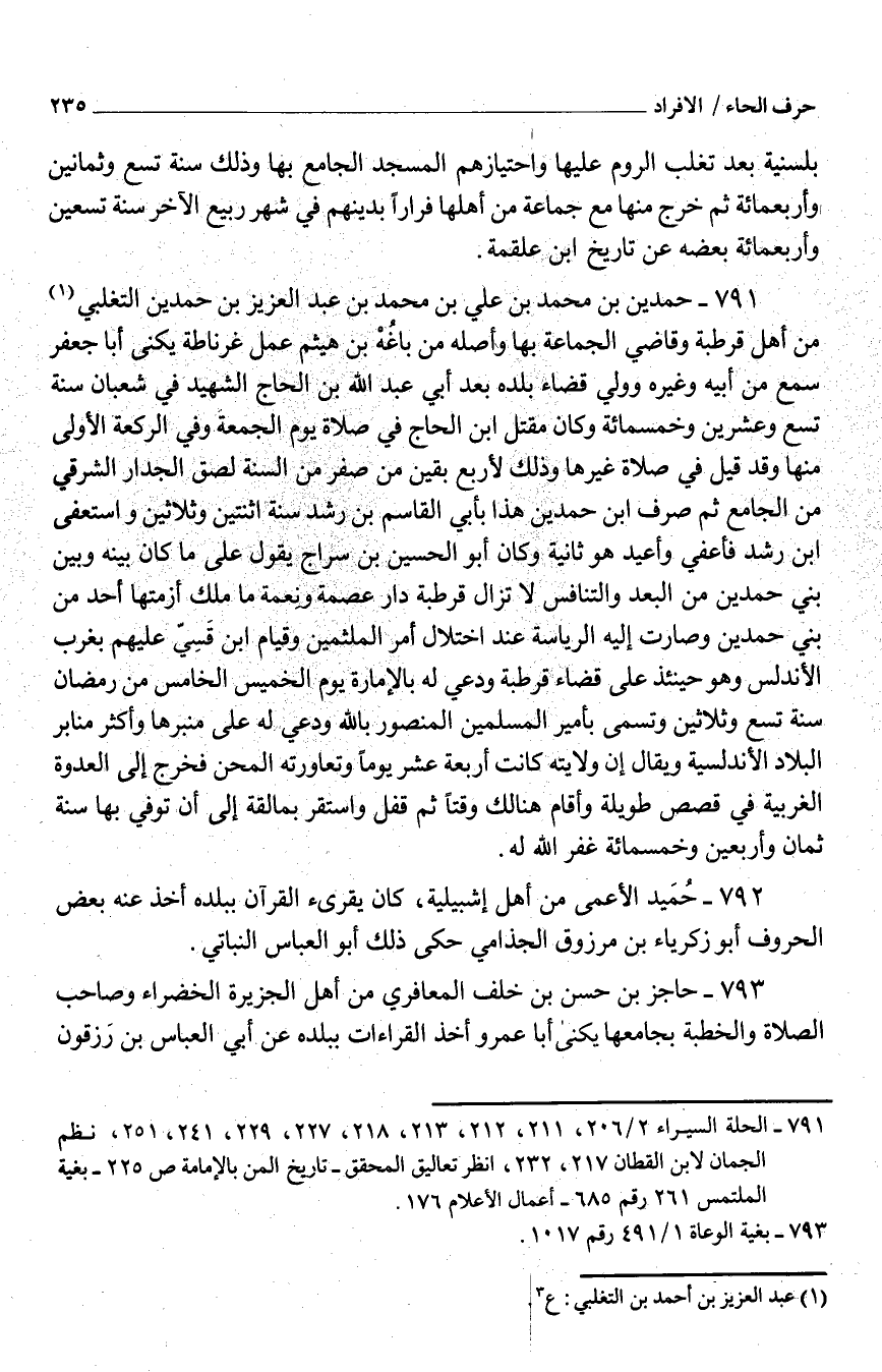 792 - حُمَيْد الْأَعْمَى من أهل إشبيلية كَانَ يقرىء الْقُرْآن بِبَلَدِهِ أَخذ عَنْهُ بَعْض الْحُرُوف أَبُو زَكَرِيَّاء بْن مَرْزُوق الجذامي حكى ذَلِكَ أَبُو الْعَبَّاس النباتي