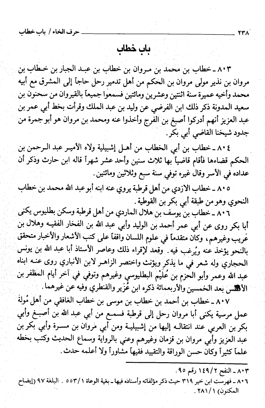 803 - خطاب بن مُحَمَّد بْن مَرْوَان بْن خطاب بْن عَبْد الجَبَّار بْن خطاب بْن مَرْوَان بْن نَذِير مولى مَرْوَان بن الحكم من أهل تدمير رَحل حَاجا إِلَى الْمشرق مَعَ أَبِيه مُحَمَّد وأخيه عميرَة سنة اثْنَتَيْنِ وَعشْرين وَمِائَتَيْنِ فَسَمِعُوا جَمِيعًا بالقيروان من سَحْنُون بن سعيد الْمُدَوَّنَة ذكر ذَلِك ابْن الفرضي عَنْ وليد بْن عَبْد الْملك وقرأت بِخَط أبي عُمَر بْن عبد الْعَزِيز أَنهم أدركوا أصبغ بْن الفَرَج وَأخذُوا عَنْهُ وَمُحَمّد بْن مَرْوَان هُوَ أبَوْ جَمْرَة من جدود شَيخنَا القَاضِي أبي بَكْر