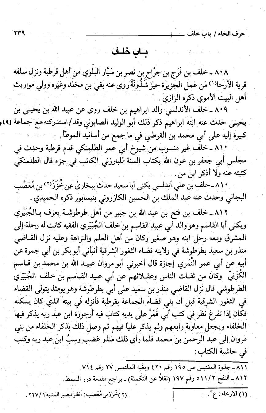 809 - خَلَف الأندلسيّ وَالِد إِبْرَاهِيم بْن خَلَف روى عَنْ عُبَيْد اللَّه بْن يحيى بْن يحيى حدَّث عَنْهُ ابْنه إِبْرَاهِيم ذَكَرَ ذَلِكَ أَبُو الْوَلِيد الصّابونيّ وَقد استدركته مَعَ جمَاعَة كَبِيرَة إِلَيْهِ عَلَى أبي مُحَمَّد بْن القُرْطُبيّ فِي مَا جمع من أَسَانِيد الْمُوَطَّأ