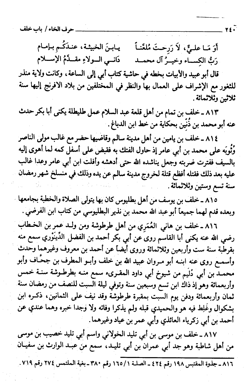 813 - خَلَف بْن تَمام من أَهْل قلعة عَبْد السّلام عمل طليطلة يكنى أَبَا بَكْر حدَّث عَنْهُ أَبُو مُحَمَّد بْن ذُنّين بحكاية من خطّ ابْن الدّباغ