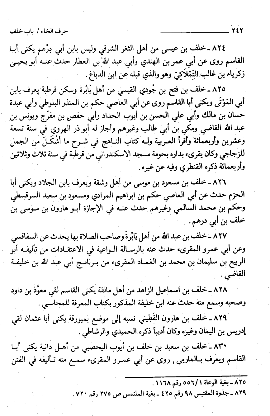 827 - خَلَف بْن عَبْد اللَّه من أَهْلَ يَابُرةَ وَصَاحب الصَّلاة بهَا يحدث عَنِ السفاقسي وَعَن أبي عَمْرو المقرىء حدَّث عَنْهُ بالرسالة الواعية فِي الاعتقادات من تأليفه أَبُو الرّبيع بْن سُلَيْمَان بْن مُحَمَّد بْن الغماد المقرىء من برنامج أبي عَبْد اللَّه بْن خَليفَة القَاضِي