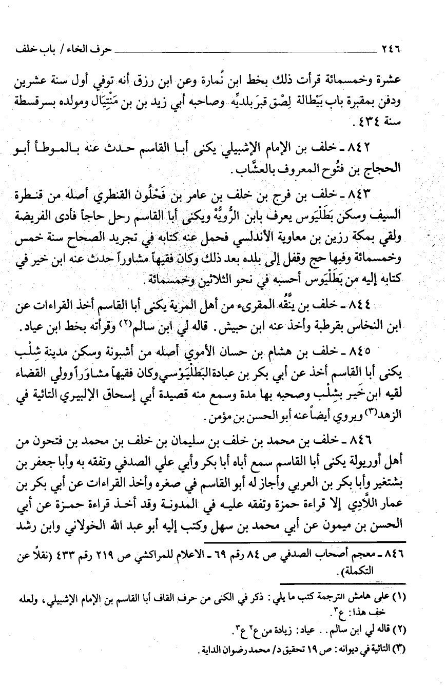 842 - خَلَف بْن الإِمَام الإشبيلي يكنى أَبَا القَاسِم حدَّث عَنْهُ بالموطأ أَبُو الحَجَّاج بْن فتُوح الْمَعْرُوف بالعشَّاب