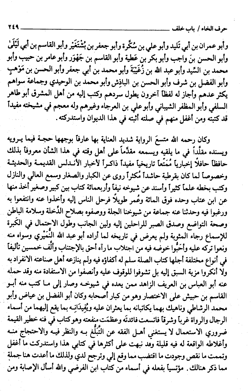 وَكَانَ رَحمَه اللَّه متسعَ الرِّوَايَة شَدِيد الْعِنَايَة بهَا عَارِفًا بوجهها حجَّة فِيمَا يرويهِ ويسنده مقلَّدًا فِي مَا يلقيه ويسمعه مقدَّمًا عَلَى أَهْل وقته فِي هَذَا الشَّأْن مَعْرُوفا بذلك حَافِظًا حافلاً إخباريًا مُمَتّعًا تاريخيًا مُفِيدا ذَاكِرًا لأخبار الأندلس الْقَدِيمَة والحديثة وخصوصاً لمّا كَانَ بقرطبة حاشدًا مُكثرًا روى عَنِ الْكِبَار وَالصغَار وَسمع العالي والنازل وَكتب بِخَطِّهِ علما كثيرا وَأسْندَ عَنْ شُيُوخه نيفا وَأَرْبَعمِائَة كتاب بَيْنَ كَبِير وصغير أَخذ مِنْهَا عَنِ ابْن عتاب وَحده فَوق الْمِائَة وعُمر طَويلا فَرَحل النّاس إِلَيْهِ وَأخذُوا عَنْهُ وانتفعوا بِهِ وَرَغبُوا فِيهِ وَحَدَّثَنَا عَنْهُ جمَاعَة من شُيُوخنَا الجلة ووصفوه بصلاح الدِّخلة وسلامة الْبَاطِن وَصِحَّة التَّوَاضُع وَصدق الصَّبْر للراحلين إِلَيْهِ ولين الْجَانِب وَطول الِاحْتِمَال فِي الكَبرة للإسماع رَجَاء المثوبة وَلم يعرض فِي تَارِيخه لمّا أَرَادَهُ أَبُو عَبْد اللَّه النُّمَيْري وسواه مِنْهُ ونعوا تَركه عَلَيْهِ وأحَبُّوا خوضه فِيه من اجتلاب مَا رَآهُ أَحَق بالاجتناب وألَّف خمسين تأليفًا فِي أَنْوَاع مُخْتَلفَة أجلهَا كتاب الصِّلَة سلم لَهُ أكفاؤه فِيهِ وَلم ينازعه أَهْل صناعته الِانْفِرَاد بِهِ وَلَا أَنْكَرُوا مزية السَّبق إِلَيْهِ بل تشوفوا للوقوف عَلَيْهِ وأنصفوا من الاستفادة مِنْهُ وَقد حمله عَنْهُ أَبُو الْعَبَّاس بْن العريف الزَّاهد مِمَّن يعده فِي شُيُوخه وَصَارَ إِلَى مَا كتب مِنْهُ أَبُو القَاسِم بْن حُبَيْش عَلَى الِاخْتِصَار وَهُوَ من كبار أَصْحَابه وَكَانَ أَبُو الفَضْل بْن عِيَاض وَأَبُو مُحَمَّد الرشاطي وناهيك بهما يكاتبانه بِمَا يَعْثرَانِ عَلِيّه ويُفيدانه بِمَا يَقع إِلَيْهِمَا من أَسمَاء الرِّجَال والرواة غربًا وشرقا فاتسعت فَائِدَته وعظمَت منفعَته وَهُوَ كتاب فِي فنه خطير الْقيمَة ضَرُورِيّ الِاسْتِعْمَال لَا يَسْتَغْنِي أَهْل الْفِقْه عَنِ التَّبَلُّغ بِهِ وَالنَّظَر فِيهِ والاحتجاج مِنْهُ وأغلاطه الْوَاقِعَة لَهُ فِيهِ قَليلَة وَقد نبهت عَلَى أَكْثَرهَا فِي كتابي هَذَا واستدركت مَا أغفل وتممت مَا نقص وجودت مَا اقتضب ممّا وَقع إليَّ وترجح لدي وَلذَلِك مَا أعدت هُنَا جملَة ممّا ذَكَرَ هُنَالك مؤتسياً بِفِعْلِهِ فِي أَسمَاء من كتاب ابْن الفَرَضيّ وَالله أسأَل الْإِصَابَة وَمن