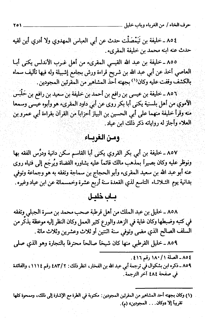 858 - خَلِيل بْن عَبْد الْملك من أَهْل قرطبة صحب مُحَمَّد بْن مَسَرَّة الْجبلي وتَفَقَّه فِي كتبه وضبطها وَكَانَ غَايَة فِي الزّهْد والورع كثير الْعَمَل وَكَانَ النّظر إِلَيْهِ موعظة يذكر من السّلف الصَّالح الَّذِي مضى وتُوُفيّ سنة اثْنَتَيْنِ أَوْ ثَلَاث وَعشْرين وَثَلَاث مائَة