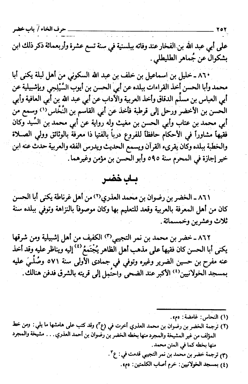 862 - خضر بْن مُحَمَّد بْن نمر التجِيبِي الكفيف من أَهْل إشبيلية وَمن شرقها يكنى أَبَا الْحَسَن كَانَ فَقِيها عَلَى مَذْهَب أَهْل الظَّاهِر يُجْتَمعُ إِلَيْهِ ويناظر عَلَيْهِ وَقد أَخذ عَنْهُ مفرح بْن حُسَيْن الضَّرِير وَغَيره وتُوُفيّ فِي جُمَادَى الأولى سنة 571 وصُلِّيَ عَلَيْهِ بِمَسْجِد الخولانيين الْأَكْبَر عِنْدَ الضُّحَى واحتُمل إِلَى قريته بالشرق فَدفن هُنَالك