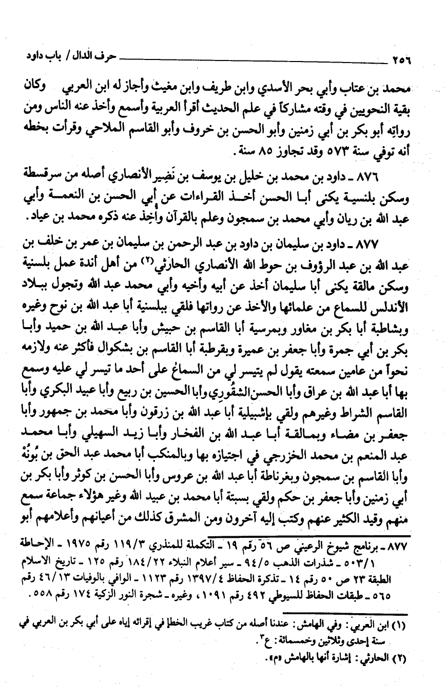 877 - دَاوُد بْن سُلَيْمَان بْن دَاوُد بْن عَبْد الرَّحْمَن بْن سُلَيْمَان بْن عُمَر بْن خَلَف بْن عَبْد اللَّه بْن عَبْد الرؤوف بْن حوط اللَّه الْأَنْصَارِيّ الْحَارِثِيّ من أَهْل أندة عمل بلسنية وَسكن مالقة يكنى أَبَا سُلَيْمَان أَخذ عَنْ أَبِيه وأخيه وَأبي مُحَمَّد عَبْد اللَّه وتجول بِبِلَاد الأندلس للسماع من علمائها وَالْأَخْذ عَنْ رواتها فلقي ببلسنية أَبَا عَبْد اللَّه بْن نوح وَغَيره وبشاطبة أَبَا بَكْر بْن مغاور ويمرسية أَبَا القَاسِم بْن حُبَيْش وَأَبا عَبْد اللَّه بْن حُمَيْد وَأَبا بَكْر بْن أبي جَمْرَة وَأَبا جَعْفَر بْن عميرَة وبقرطبة أَبَا القَاسِم بْن بشكوال فَأكْثر عَنْهُ ولازمه نَحوا من عَاميْنِ سمعته يَقُولُ لَمْ يَتَيَسَّر لي من السماع عَلَى أحد مَا تيَسّر لي عَلَيْهِ وَسمع بهَا أَبَا عَبْد اللَّه بْن عراق وَأَبا الْحَسَن الشقُوري وَأَبا الْحُسَيْن بْن ربيع وَأَبا عُبَيْد الْبكْرِيّ وَأَبا القَاسِم الشراط وَغَيرهم وَلَقي بإشبيلية أَبَا عَبْد اللَّه بْن زرقون وَأَبا مُحَمَّد بْن جُمْهُور وَأَبا جَعْفَر بْن مضاء وبمالقة أَبَا عَبْد اللَّه بْن الفخار وَأَبا زَيْدُ السُّهيْلي وَأَبا مُحَمَّد عَبْد الْمُنعم بْن مُحَمَّد الخزرجي فِي اجتيازه بهَا وبالمنكب أَبَا مُحَمَّد عَبْد الْحق بْن بُونُهْ وَأَبا القَاسِم بْن سمجون وبغرناطة أَبَا عَبْد اللَّه بْن عروس وَأَبا الْحَسَن بْن كوثر وَأَبا بَكْر بْن أبي زمنين وَأَبا جَعْفَر بْن حكم وَلَقي بسبتة أَبَا مُحَمَّد بْن عُبَيْد اللَّه وَغير هَؤُلَاءِ جمَاعَة سَمِعَ مِنْهُم وَقيد الْكثير عَنْهُم وَكتب إِلَيْهِ آخَرُونَ وَمن الْمشرق كَذَلِك من أعيانهم وأعلامهم أَبُو