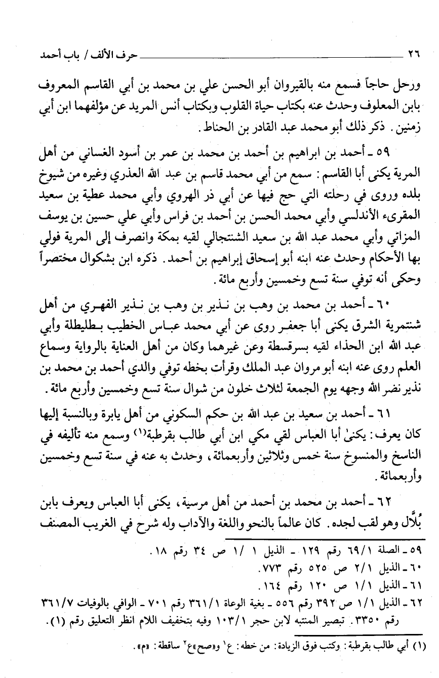 59 - أَحْمَد بْن إِبْرَاهِيم بْن أَحْمَد بْن مُحَمَّد بْن عُمَر بْن أسود الغساني من أَهْلَ المرية يكنى أَبَا القَاسِم سَمِعَ من أبي مُحَمَّد قَاسم بْن عَبْد اللَّه العذري وَغَيره من شُيُوخ بَلَده وروى فِي رحلته الَّتِي حجّ فِيهَا عَنْ أبي ذَر الهَرَويّ وَأبي مُحَمَّد عَطِيَّة بن سعيد المقرىء الأندلسي وَأبي مُحَمَّد الْحسن بن أَحْمد بن فراس وَأبي عَليّ حُسَيْن بن يُوسُف المزاتي وَأبي مُحَمَّد عبد الله بن سعيد الشنتجالي لقِيه بِمَكَّة وَانْصَرف إِلَى المرية فولي بهَا الْأَحْكَام وحدَّث عَنْهُ ابْنه أَبُو إِسْحَاق إِبْرَاهِيم بْن أَحْمَد ذكره ابْن بشكوال مُخْتَصرا وَحكى أَنَّهُ تُوُفّي سنة تسع وَخمسين وَأَرْبع مائَة