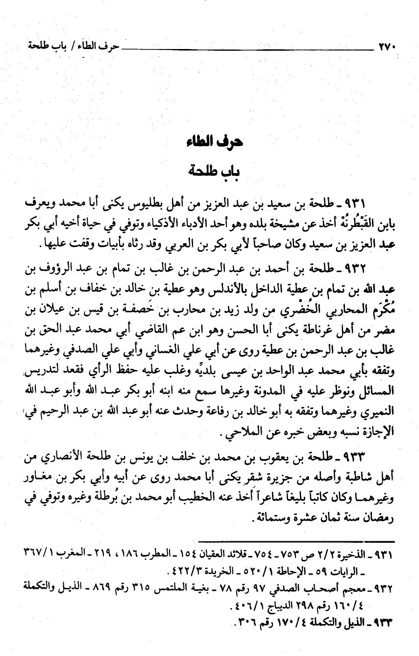 932 - طَلْحَة بْن أَحْمَد بْن عَبْد الرَّحْمَن بْن غَالب بْن تَمام بْن عَبْد الرؤوف بْن عَبْد اللَّه بْن تَمام بْن عَطِيَّة الدَّاخِل بالأندلس وَهُوَ عَطِيَّة بْن خَالِد بْن خفاف بْن أسلم بْن مُكْرَم الْمحَاربي الخَضْري من ولد زَيْدُ بن محَارب بْن خَصفة بْن قيس بْن عيلان بْن مُضر من أَهْل غرناطة يكنى أَبَا الْحسن وَهُوَ ابْن عَم القَاضِي أبي مُحَمَّد عَبْد الْحق بْن غَالب بْن عَبْد الرَّحْمَن بْن عَطِيَّة روى عَنْ أبي عَلِيّ الغساني وَأبي عَلِيّ الصَّدَفِي وَغَيرهمَا وتَفَقَّه بِأبي مُحَمَّد عَبْد الْوَاحِد بْن عِيسَى بلديِّه وَغلب عَلَيْهِ حفظ الرَّأْي فَقعدَ لتدريس الْمسَائِل ونوظر عَلَيْهِ فِي الْمُدَوَّنَة وَغَيرهَا سمع مِنْهُ ابْنه أَبُو بَكْر عَبْد اللَّه وَأَبُو عَبْد اللَّه النميري وَغَيرهمَا وتَفَقَّه بِهِ أَبُو خَالِد بْن رِفَاعَة وحدَّث عَنْهُ أَبُو عَبْد اللَّه بْن عَبْد الرَّحِيم فِي الْإِجَازَة نسبه وَبَعض خَبره عَنِ العلاحي