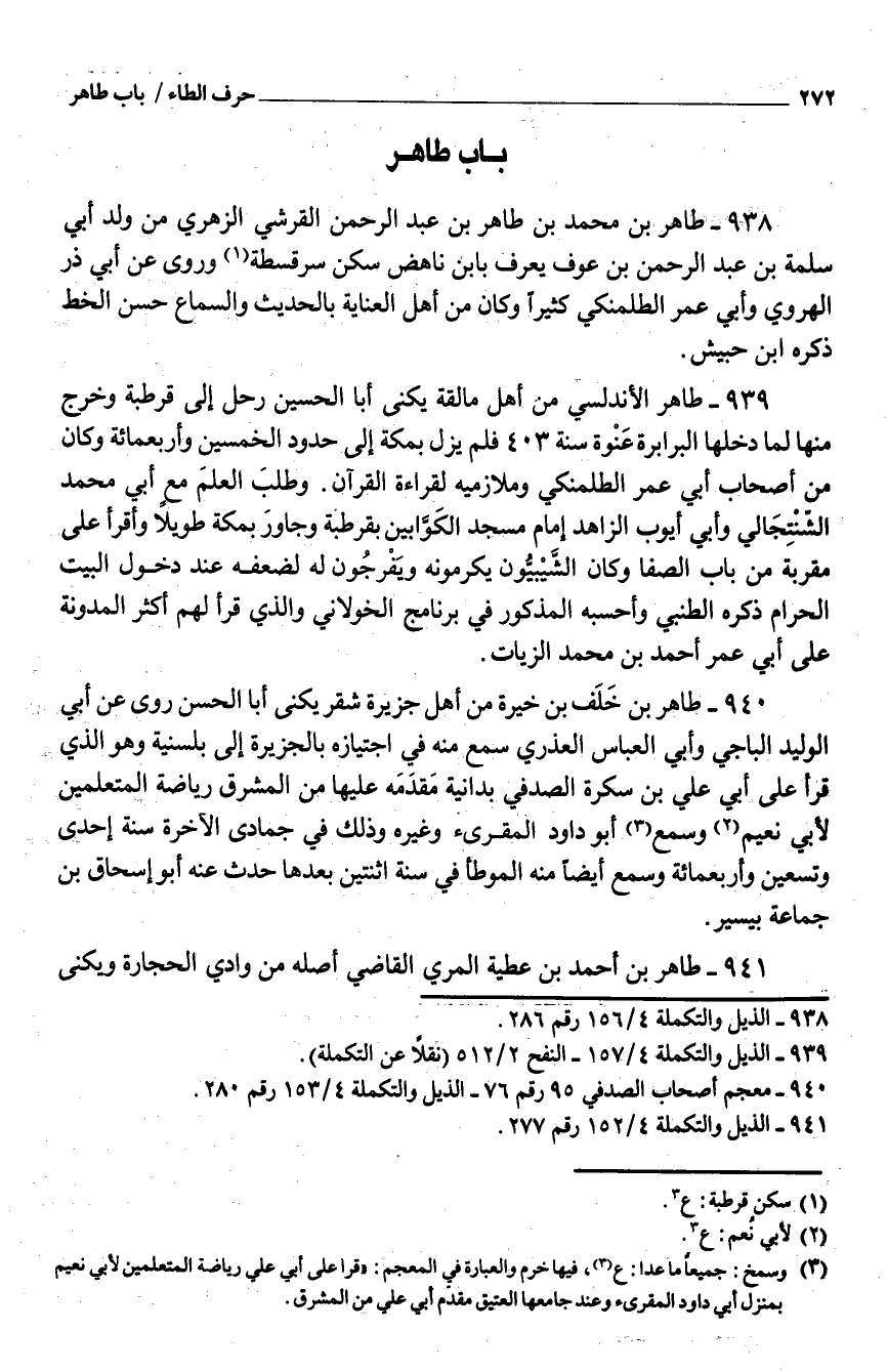 939 - طَاهِر الأندلسيّ من أَهْل مالقة يكنى أَبَا الْحُسَيْن رَحل إِلَى قرطبة وَخرج مِنْهَا لمّا دَخلهَا البرابرة عَنْوة سنة 403 فَلم يزل بِمَكَّة إِلَى حُدُود الْخمسين وَأَرْبَعمِائَة وَكَانَ من أَصْحَاب أبي عُمَر الطلمنكي وملازميه لقِرَاءَة الْقُرْآن وطلبَ الْعلم مَعَ أبي مُحَمَّد الشِّنْتِجالي وَأبي أَيُّوب الزَّاهد إِمَام مَسْجِد الكَوَّابين بقرطبة وجاورَ بِمَكَّة طَويلا وأقرأ عَلَى مقربة من بَاب الصَّفَا وَكَانَ الشَّيْبيُّون يكرمونه ويَفْرجُون لَهُ لضَعْفه عِنْدَ دُخُول الْبَيْت الْحَرَام الطنبي وَأَحْسبهُ الْمَذْكُور فِي برنامج الْخَولَانِيّ وَالَّذِي قَرَأَ لَهُمْ أَكثر الْمُدَوَّنَة عَلَى أبي عُمَر أَحْمَد بْن مُحَمَّد الزيات
