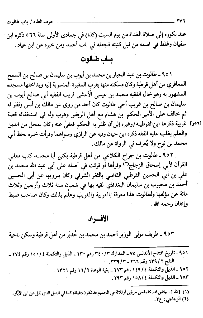 952 - طالوت بْن جراح الكلَاعِي من أَهْل قرطبة يكنى أَبَا مُحَمَّد كتب مَعَاني الْقُرْآن لأبي إِسْحَاق الزَّجّاج وَقرأَهَا أَو قُرِئت من أَصله عَلَى أبي عَبْد اللَّه مُحَمَّد بْن عَلِيّ بْن أبي الْحُسَيْن القُرْطُبيّ القَاضِي بالثغر الشَّرْقِي وَكَانَ يَرْوِيهَا عَنْ أبي الْحُسَيْن أَحْمَد بْن مَحْبُوب بْن سُلَيْمَان الْبَغْدَادِيّ لقِيه بهَا فِي شعْبَان سنة ثَلَاث وَأَرْبَعين وَثَلَاث مائَة عَنْ مؤلفها ولطالوت هَذَا معرفَة بِالْعَرَبِيَّةِ والغريب وعلَّم بذلك وَكَانَ صَاحب ضبط وإتقان رَحمَه الله