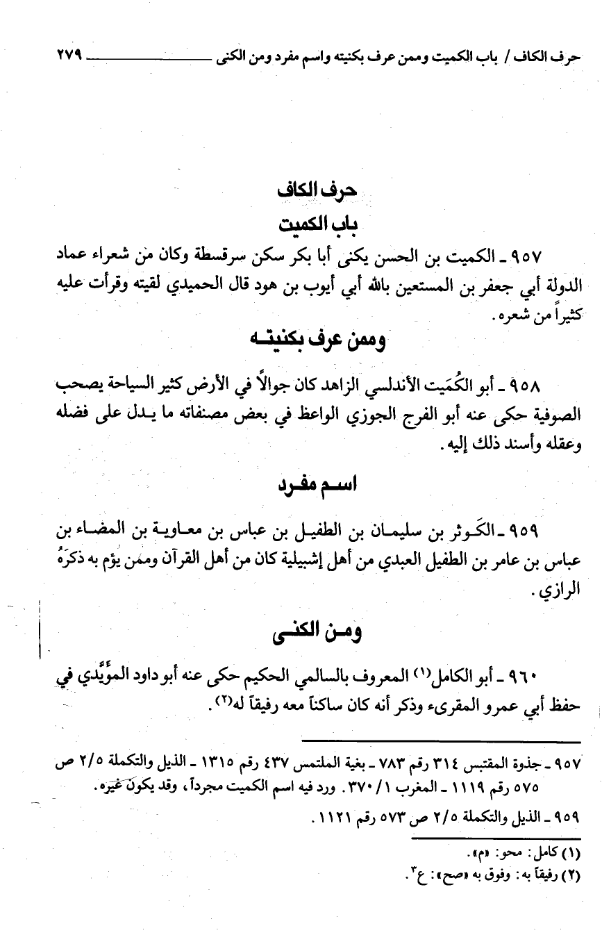 957 - الْكُمَيْت بْن الْحَسَن يكنى أَبَا بَكْر سكن سرقسطة وَكَانَ من شعراء عماد الدّولة أبي جَعْفَر بْن المستعين بِاللَّه أبي أَيُّوب بن هود قَالَ الْحميدِي لَقيته وقرأت عَلَيْهِ كثيرا من شِعره