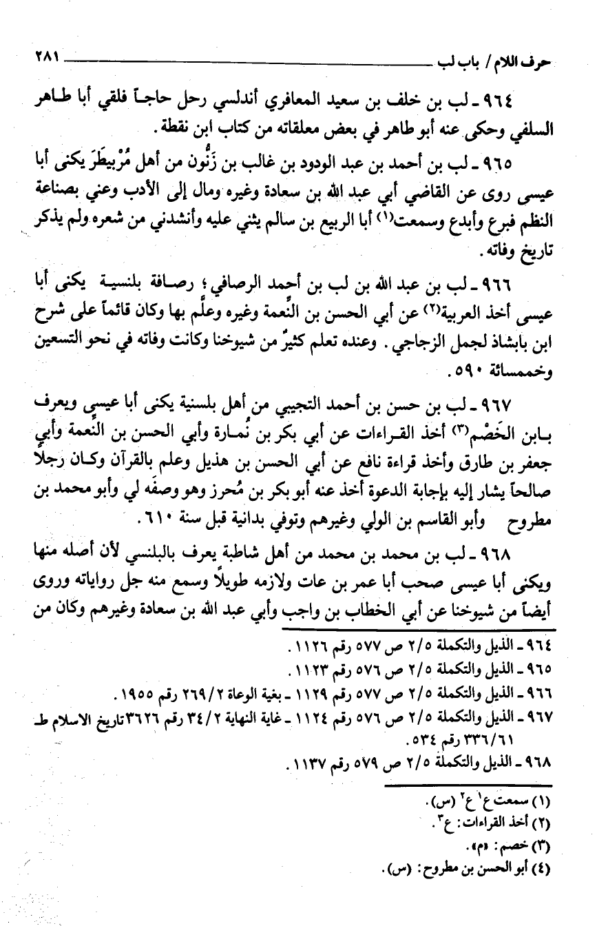 964 - لب بْن خَلَف بْن سَعِيد الْمعَافِرِي أندلسي رَحل حَاجا فلقي أَبَا طَاهِر السِّلَفيّ وَحكى عَنْهُ أَبُو طَاهِر فِي بَعْض معلقاته من كتاب ابْن نقطة