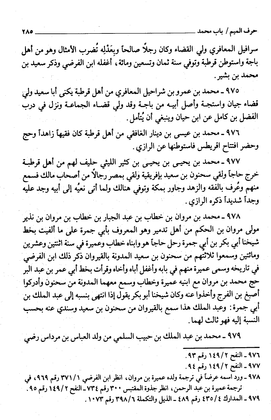 978 - مُحَمَّد بْن مَرْوَان بن خطاب وعميرة بْن عَبْد الجَبَّار بْن خطاب بْن مَرْوَان بْن نَذِير مولى مَرْوَان بْن الحكم من أَهْلَ تدمير وَهُوَ الْمَعْرُوف بِأبي جَمْرَة عَلَى مَا ألفيت بِخَط شَيخنَا أبي بَكْر بْن أبي جَمْرَة رَحل حَاجا هُوَ وابناه خطاب وعميرة فِي سنة اثْنَتَيْنِ وَعشْرين وَمِائَتَيْنِ وسمعوا ثَلَاثَتهمْ من سَحْنُون بْن سَعِيد الْمُدَوَّنَة بالقيروان ذكر ذَلِكَ ابْن الفَرَضيّ فِي تَارِيخه وسمى عميرَة مِنْهُم فِي بَابه وأغفل أَبَاهُ وأخاه وقرأت بِخَط أَبِي عَمْرو بن عبد الْبر حجّ مُحَمَّد بْن مَرْوَان مَعَ ابنيه عميرَة وخطاب وَسمع مَعَهُمَا الْمُدَوَّنَة من سَحْنُون وأدركوا أصبغ بْن الفَرَج وَأخذُوا عَنْهُ وَكَانَ شَيخنَا أَبُو بكر يَقُول إِذْ انْتهى بنسبه إِلَى عَبْد الْملك بْن أبي جَمْرَة وَعبد الْملك هَذَا سَمِعَ بالقيروان من سَحْنُون بْن سَعِيد وسندي عَنْهُ بِحَسب النِّسْبَة إِلَيْهِ فَهُوَ ثَالِث لَهما