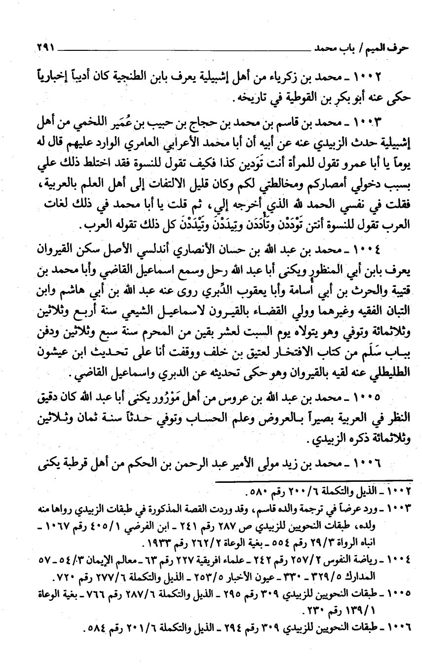 1005 - مُحَمَّد بن عبد الله بن عروس من أهل مورور يكنى أَبَا عبد الله كَانَ دَقِيق النّظر فِي الْعَرَبيَّة بَصيرًا بالعروض وَعلم الْحساب وَتُوفِّي حَدثا سنة ثَمَان وَثَلَاثِينَ وثلاثمائة ذكره الزبيدِيّ