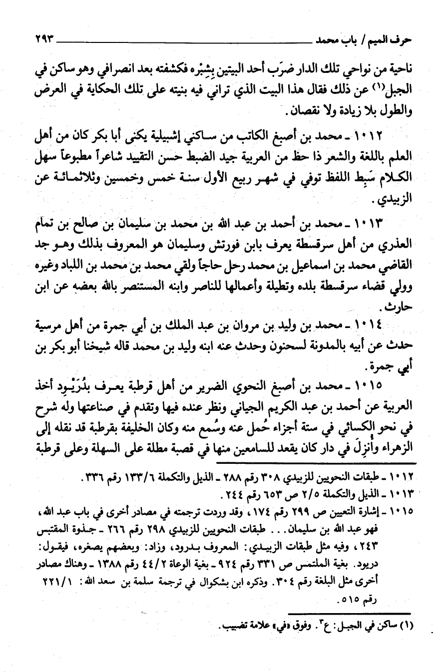 1012 - مُحَمَّد بْن أصبغ الْكَاتِب من سَاكِني إشبيلية يكنى أَبَا بَكْر كَانَ من أَهْل الْعلم باللغة وَالشعر ذَا حَظّ من الْعَرَبيَّة جيّد الضَّبْط حَسَن التَّقْيِيد شَاعِرًا مطبوعًا سهل الْكَلَام سَبِط اللَّفْظ تُوُفّي فِي شهر ربيع الأوّل سنة خمس وَخمسين وثلاثمائة عَنِ الزَّبِيديّ