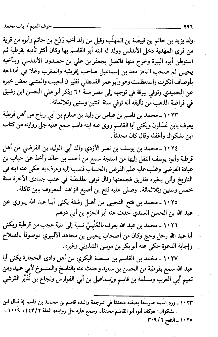 1027 - مُحَمَّد بْن القَاسِم بْن مسْعدَة الْبكْرِيّ من أَهْل وَادي الْحِجَارَة يكنى أَبَا عَبْد اللَّه سَمِعَ بقرطبة من الْحَسَن بْن سَعِيد وحدَّث عَنْهُ بالناسخ والمنسوخ لأبي عُبَيْد وَمن تَمِيم أبي الْعَرَب ومسلمة بْن قَاسم وَإِسْمَاعِيل بْن أبي الفوارس ونجاح بْن نُذَيْر الْقُرَشِيّ